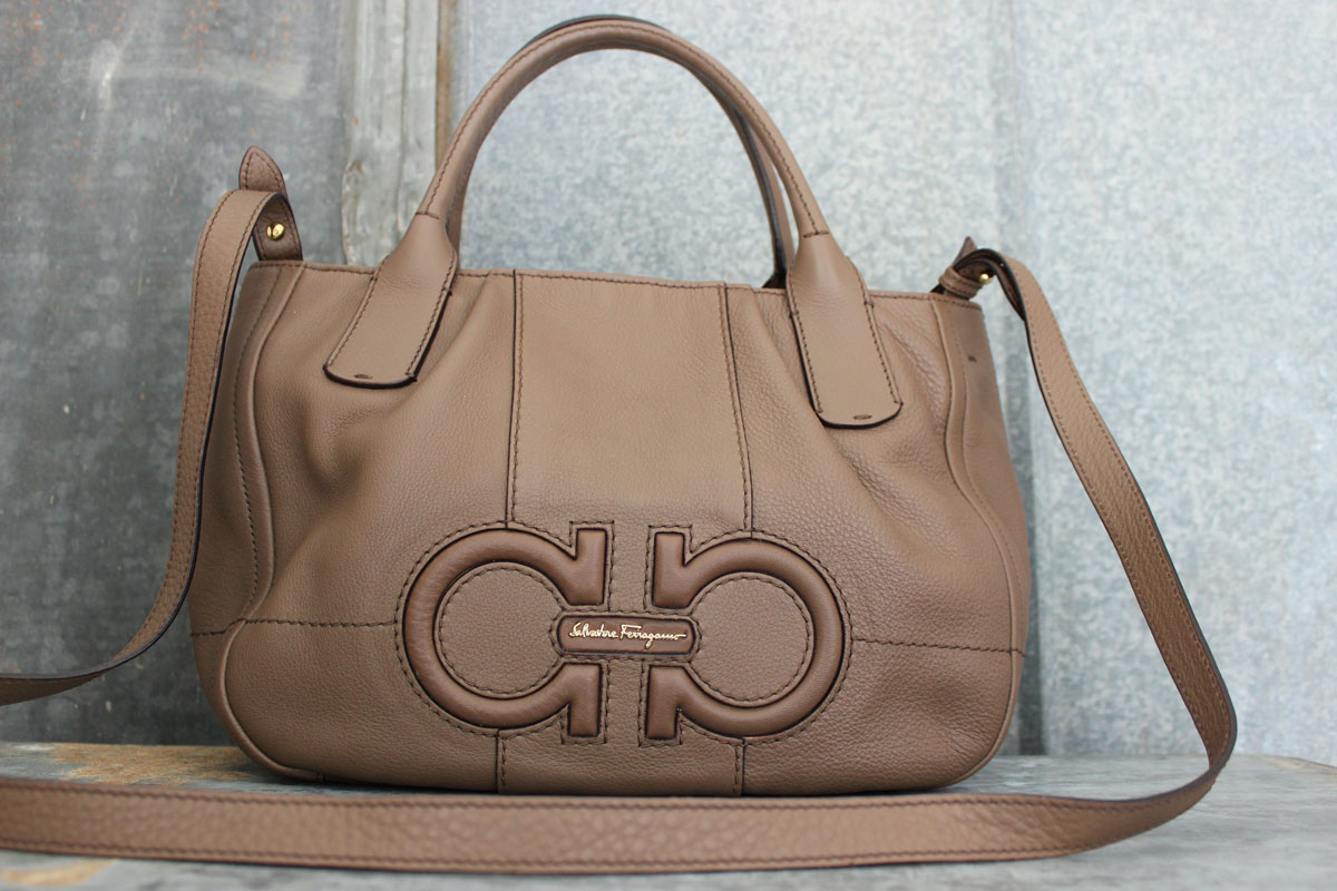 Ferragamo Izzie Gancini-Embossed Tote Bag. This bag is in NEW condition with dust cover. Features soft brown calfskin leather with tonal topstitching and signature Gancini embossing. Tote handles with 4″ drop and removable shoulder strap. Zip top. Textile lining with one zippered and two flat pockets. Measures 12″ x 11″ x 6″. Made in Italy. Serial/Authenticity: AB-21D685. Current retail is $995.
