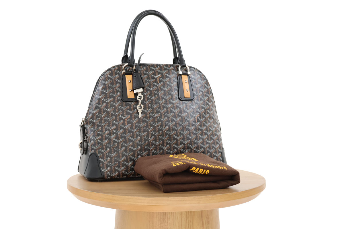 Goyard Vendome PM. Features Goyardine canvas with black chevroches calfskin and palladium hardware. Four riveted beech wood rods secure the double top handles. Five studs to protect the base. Zip closure. Padlock, keys and clochette. Yellow cotton lining with pocket. Measures 14″ x 11″ x 6″. Handles have a drop of approx. 4.75″ to top of bag. Made in France. This Goyard Vendome PM is in pristine condition. Comes with dust cover.
