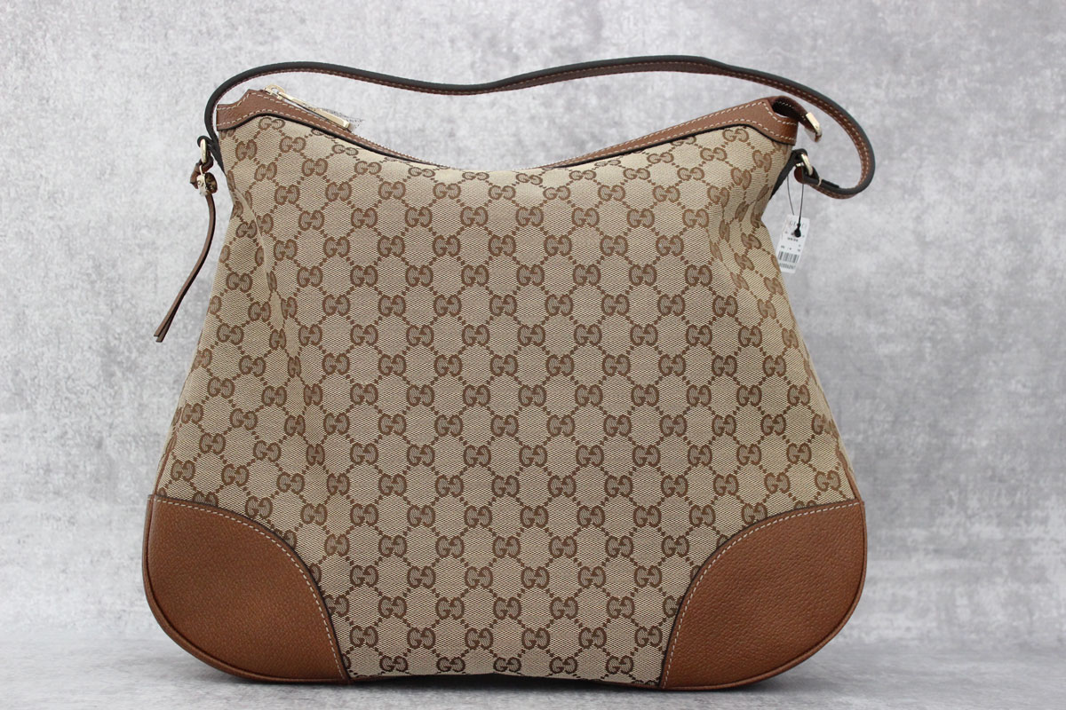 Gucci Bree GG Canvas & Leather Hobo. Model 336754 213048. Tan & brown GG monogram canvas with leather trim, light gold hardware, zip-top closure and cotton/linen lining with zippered pocket and smart phone pockets. Brown leather tassel and small GG charm hangs at one end. Strap has a drop of 8.5″ to top of bag. Measures 15 3/4″ x 13″ x 4″. Made in Italy. This bag is brand new. Protective plastic still covers the hardware. Tag attached. Comes with dust cover, booklet and fabric swatch.