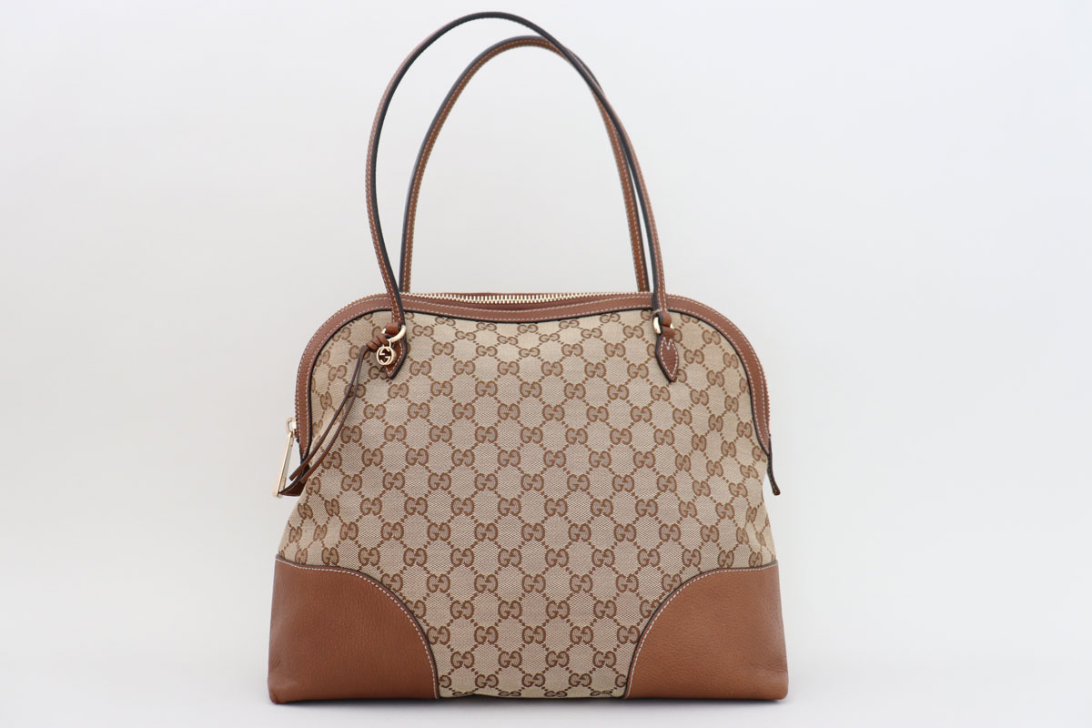 Gucci Brown Monogram GG Supreme Bree Shoulder Bag. Features GG monogram canvas, brown leather trim, zip-top closure, double straps with 8″ drop to top of bag and textile lining with zippered pocket and two slip-in pockets. A GG charm hangs at one side of strap. Measures approx. 13.5″ x 12″ x 5.25″. Made in Italy. Style: 323673 200047. Authenticity: F015528964. This bag is in very good condition and comes with dust cover. There is rubbing at the bottom corners, some marks on the exterior canvas and some scratches on the zipper pull. The interior has some minor marks.
