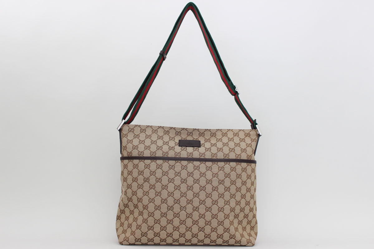 Gucci Monogram Canvas Web Messenger. Features monogram GG canvas, zip-top closure, adjustable web strap, front slip-in compartment and brown textile lining with zippered pocket and cell phone pocket. Measures 14″ x 12″ x 4.75″. Strap is fully adjustable. Made in Italy. Serial/Authenticity: 189751 213048. This bag is in pristine condition. The interior looks like nothing was ever put in it. No dust cover.