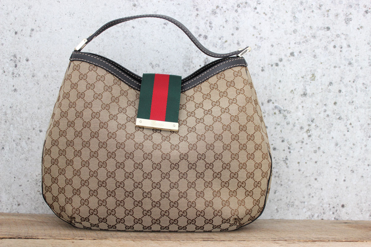 Gucci ‘New Ladies Web’ Large Hobo. This bag is in PRISTINE condition and comes with dust cover. IT DOES NOT LOOK LIKE IT WAS EVER CARRIED. Not a single mark, flaw or speck of dust. Features beige/ebony gg monogram canvas, light gold hardware, green/reb/green web belt clasp with Gucci script, single leather strap with approx. 7″ drop to top of bag and brown textile lining with zippered pocket and cell phone pocket. Serial/Authenticity: 233604 525040. Measures 16″ at widest x 12″ at tallest, x 4″. Made in Italy.
