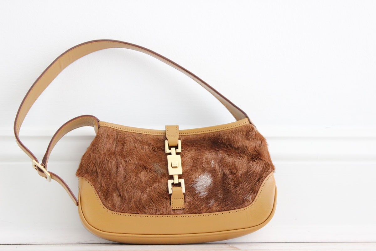 Gucci Pony Hair Mini JACKIE O Bag. Features tan leather, pony hair and golden piston closure. Strap has a drop of 8.5″. Black textile signature lining with zippered pocket. Measures 8.75″ x 5″ x 1.5″. Serial/Authenticity: 007-2039 000926. Made in Italy. Comes with dust cover. Never carried. Strap is a little bent toward one side from storage but will straighten out with use.