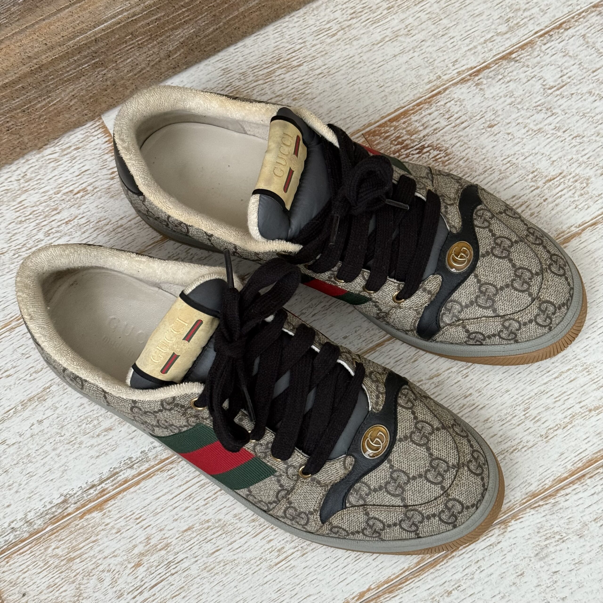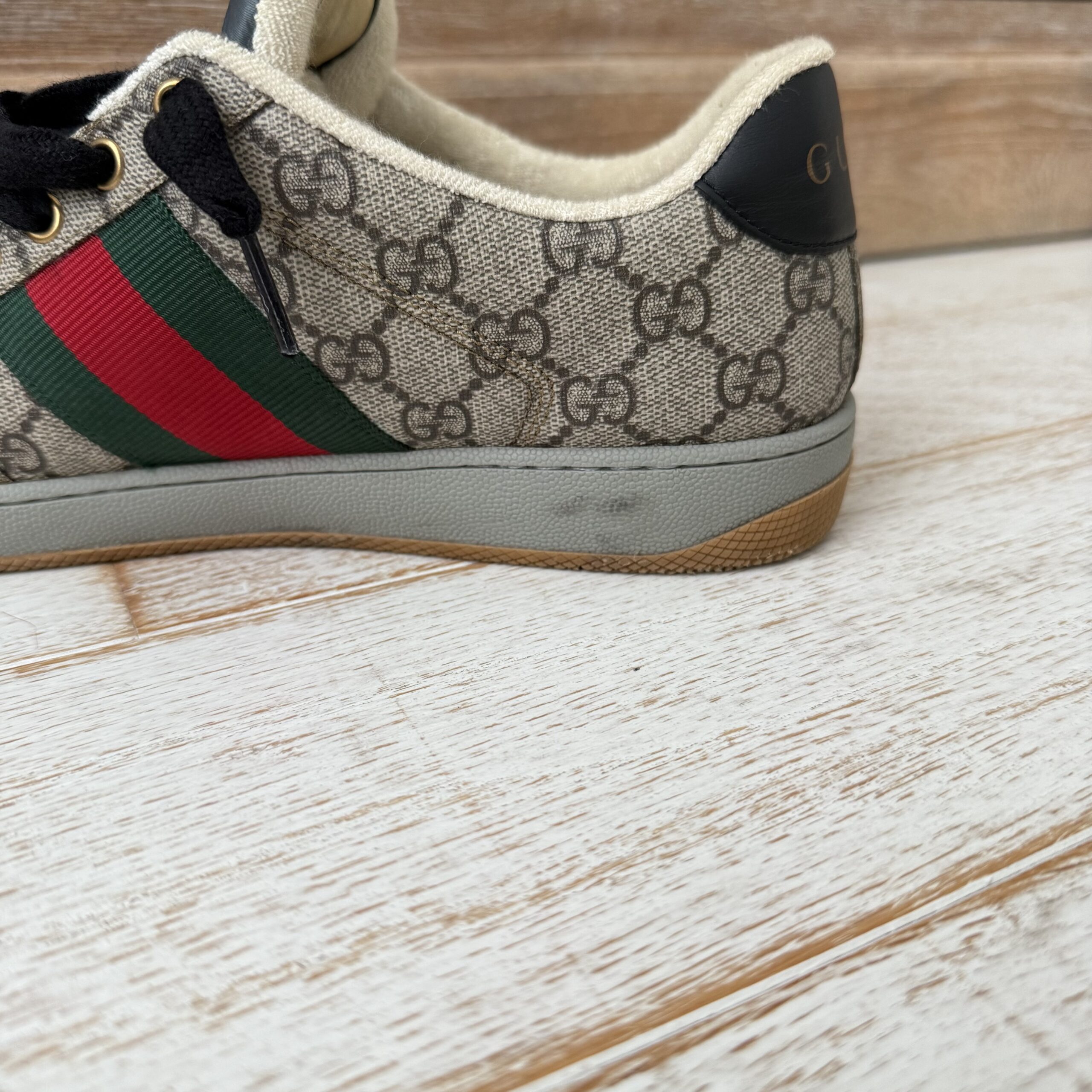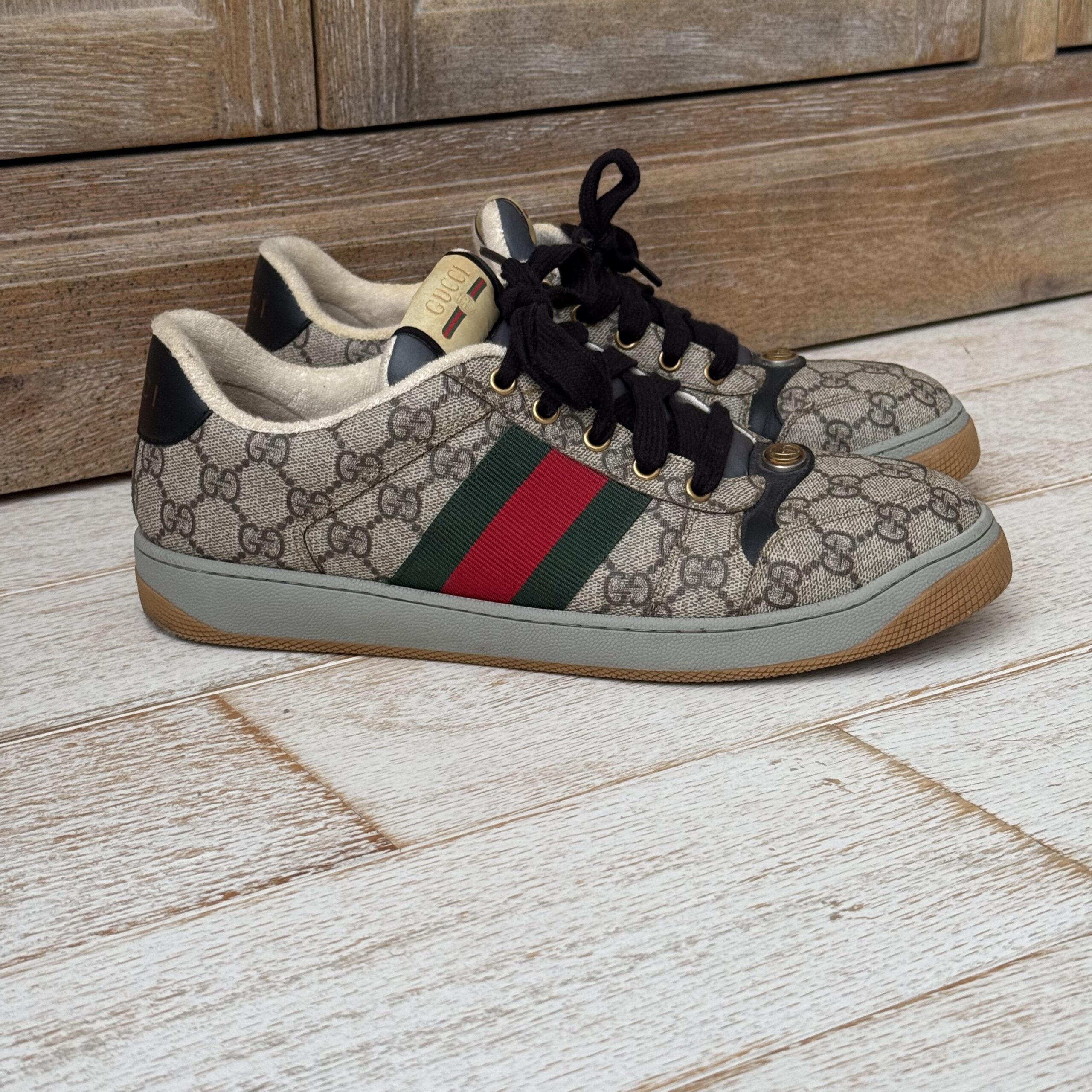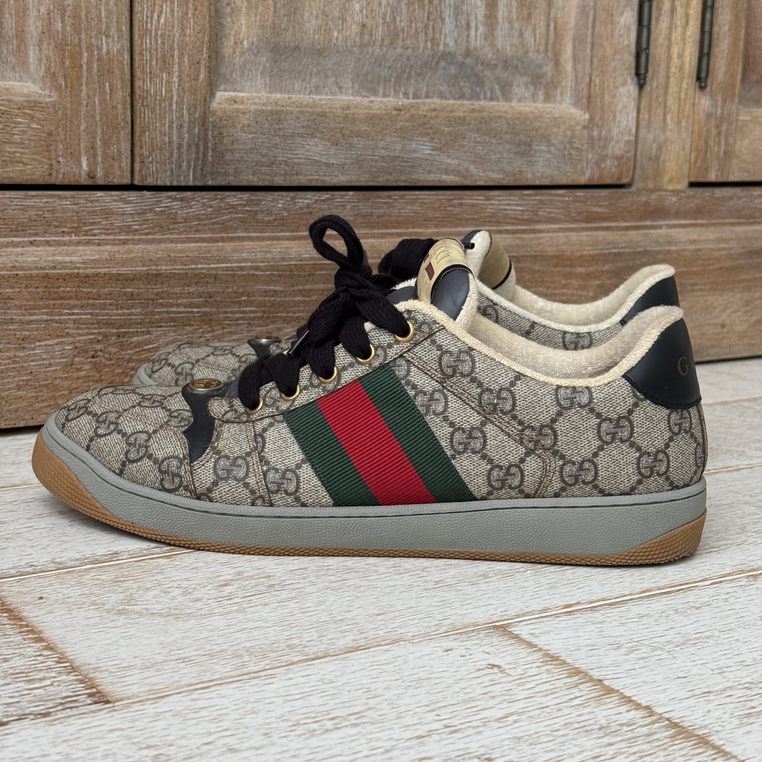 Gucci Screener GG Canvas Low-Top Sneakers. Gucci men’s size 8 fits US size 8.5-9. Worn a few times. There are some marks on the inside and on the soles. Some scuff marks near the bottoms and some wear to the inner fabric around the heel area. Very slight cigarette odor. No dust covers. No box.