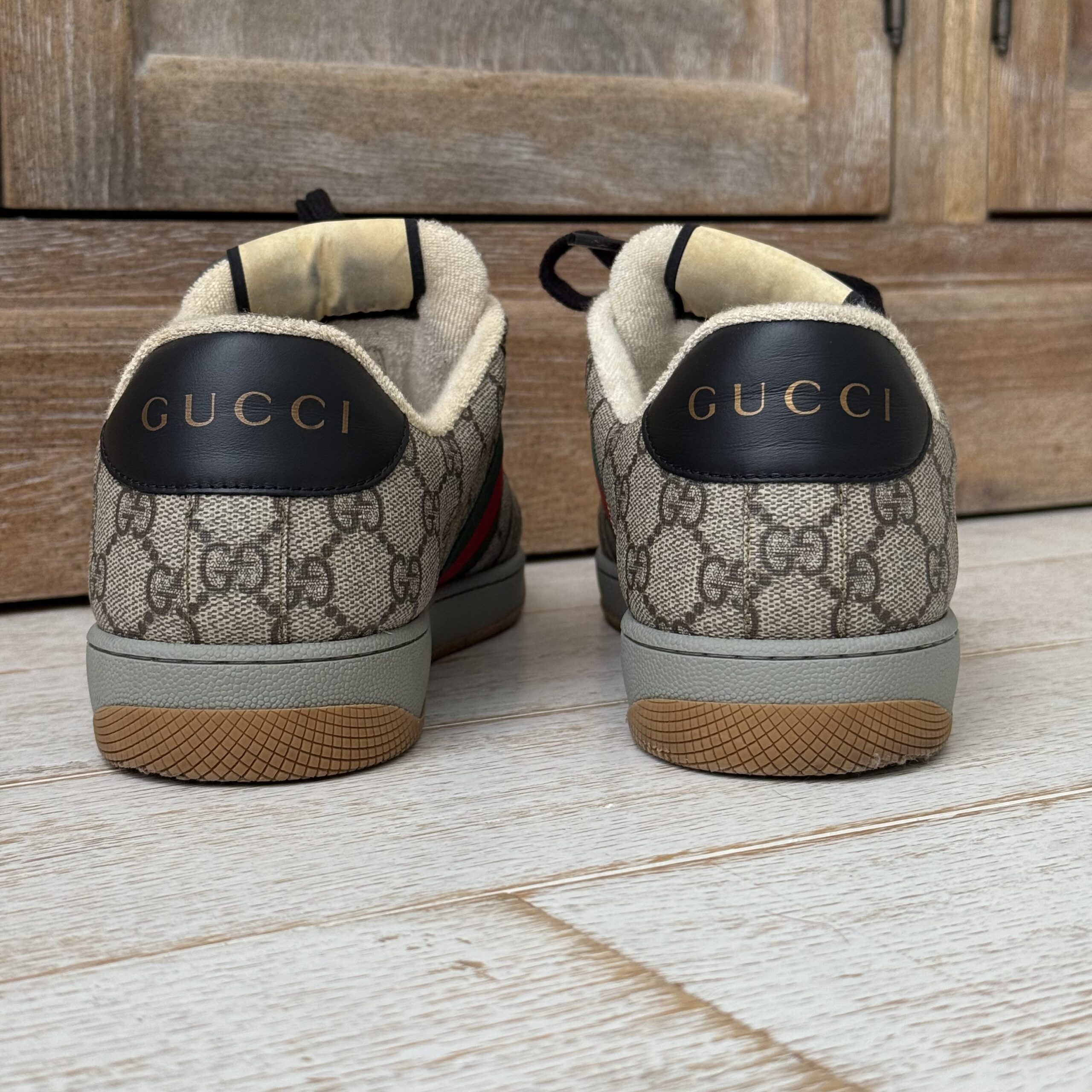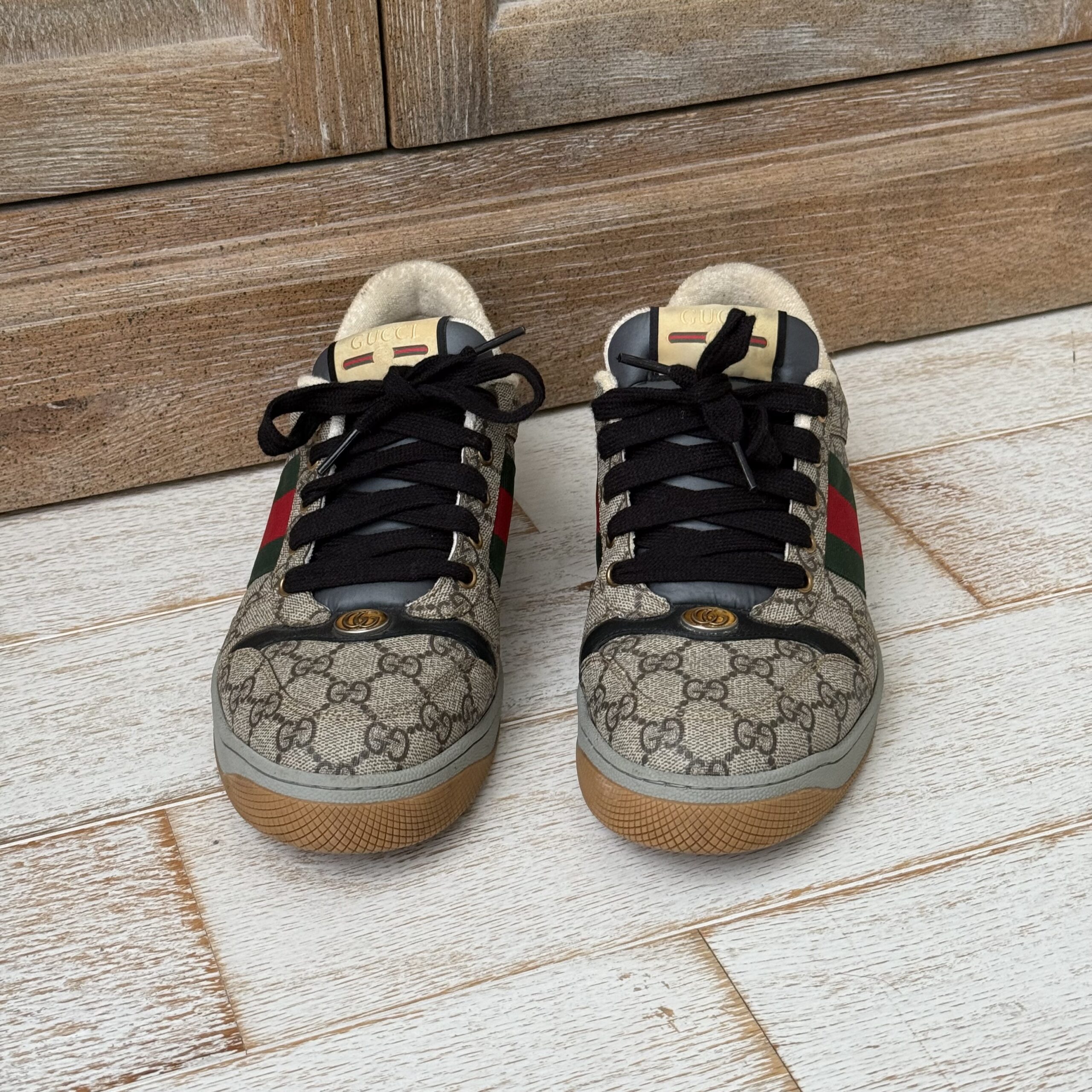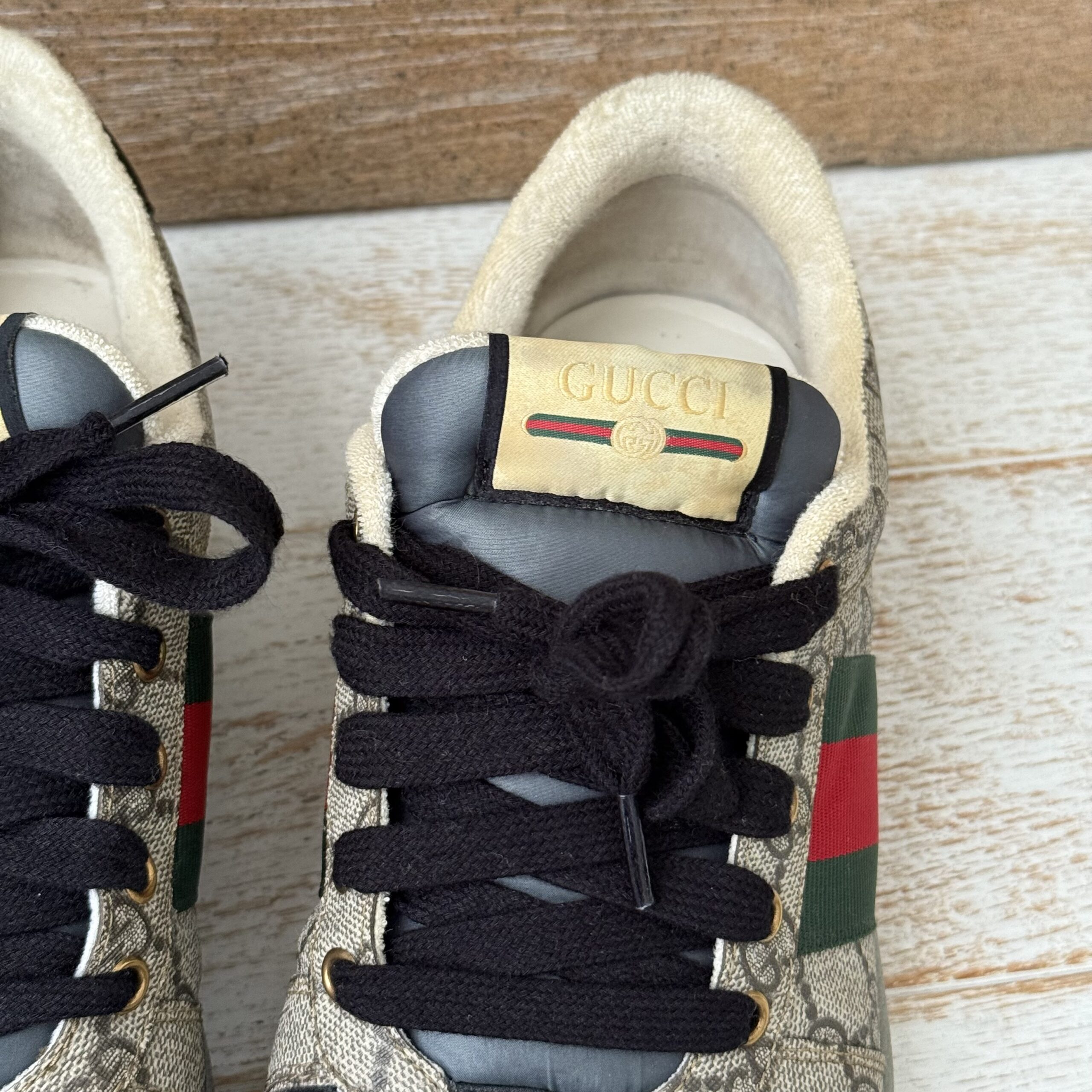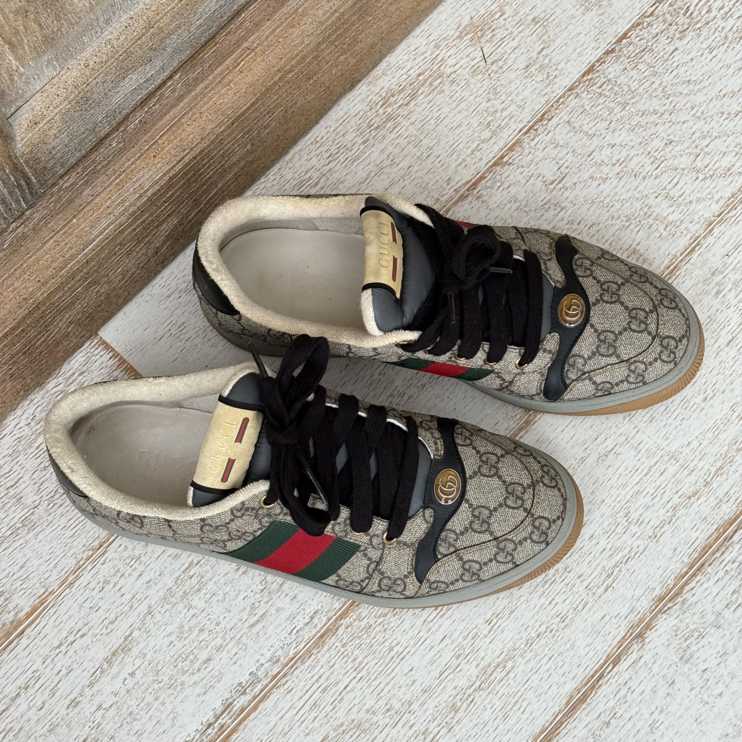 Gucci Screener GG Canvas Low-Top Sneakers. Gucci men’s size 8 fits US size 8.5-9. Worn a few times. There are some marks on the inside and on the soles. Some scuff marks near the bottoms and some wear to the inner fabric around the heel area. Very slight cigarette odor. No dust covers. No box.