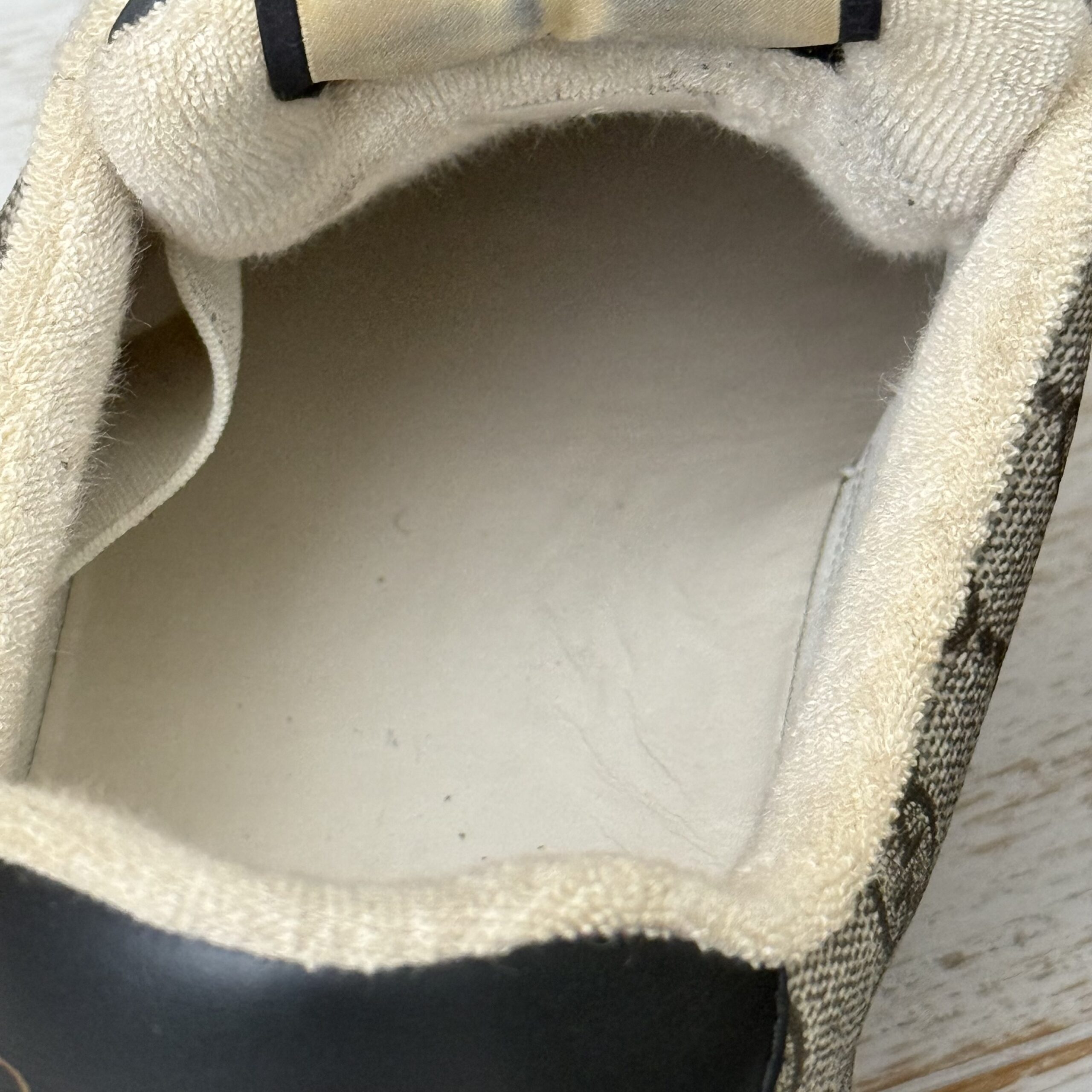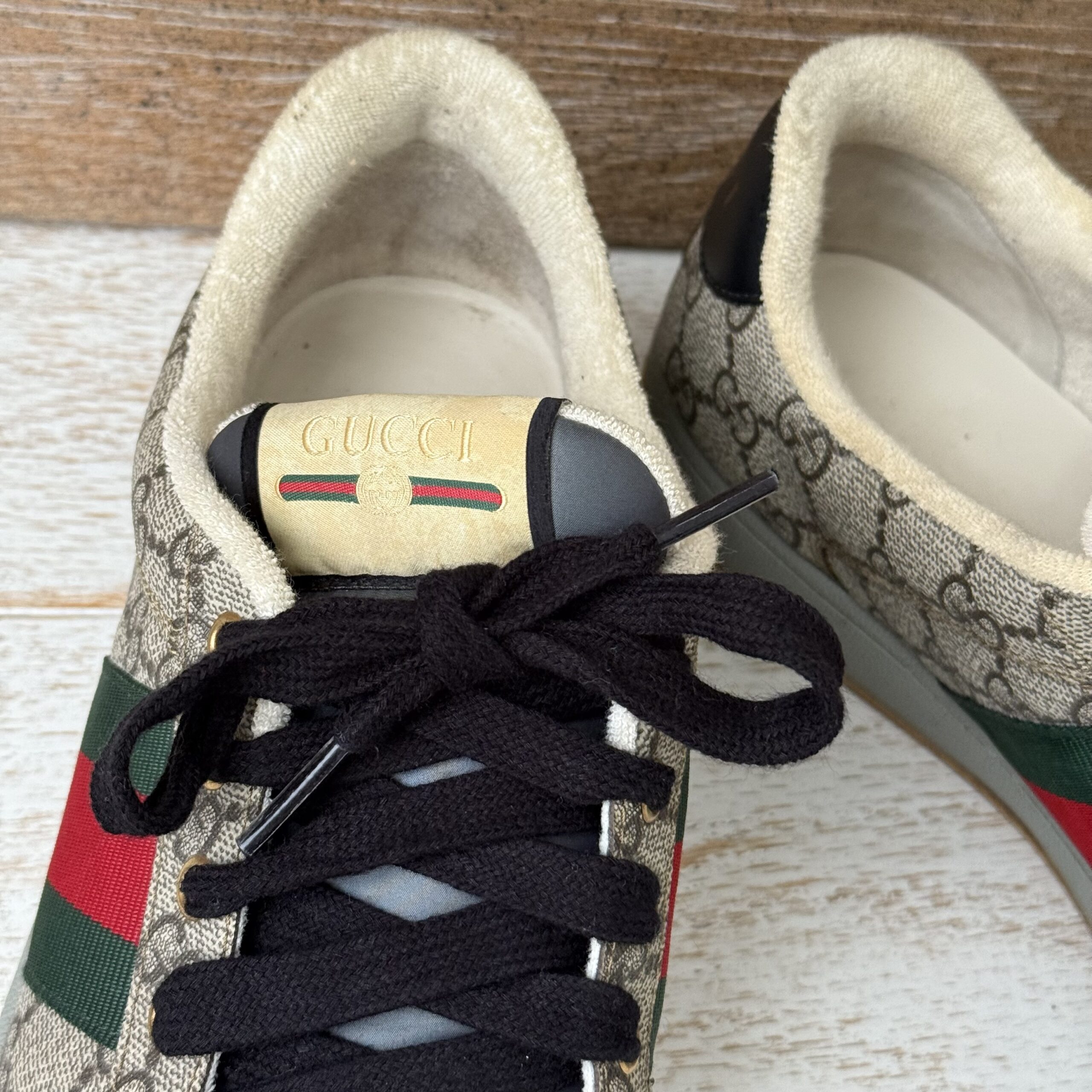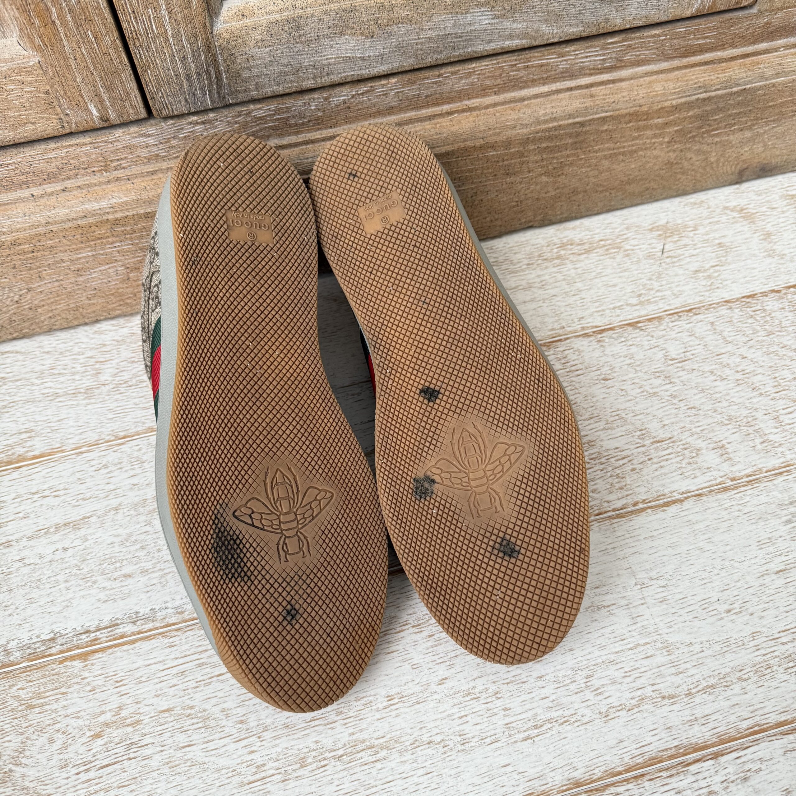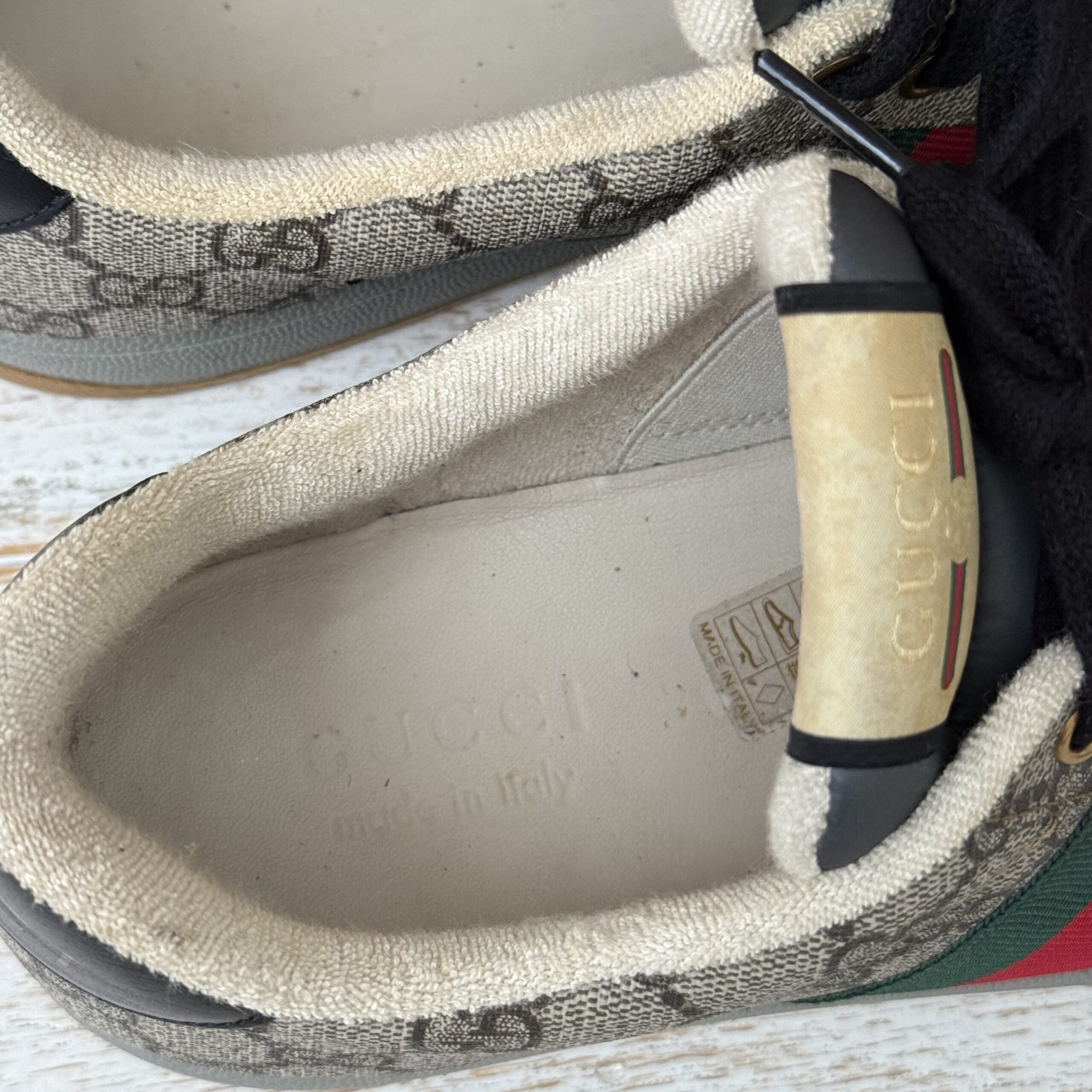 Gucci Screener GG Canvas Low-Top Sneakers. Gucci men’s size 8 fits US size 8.5-9. Worn a few times. There are some marks on the inside and on the soles. Some scuff marks near the bottoms and some wear to the inner fabric around the heel area. Very slight cigarette odor. No dust covers. No box.