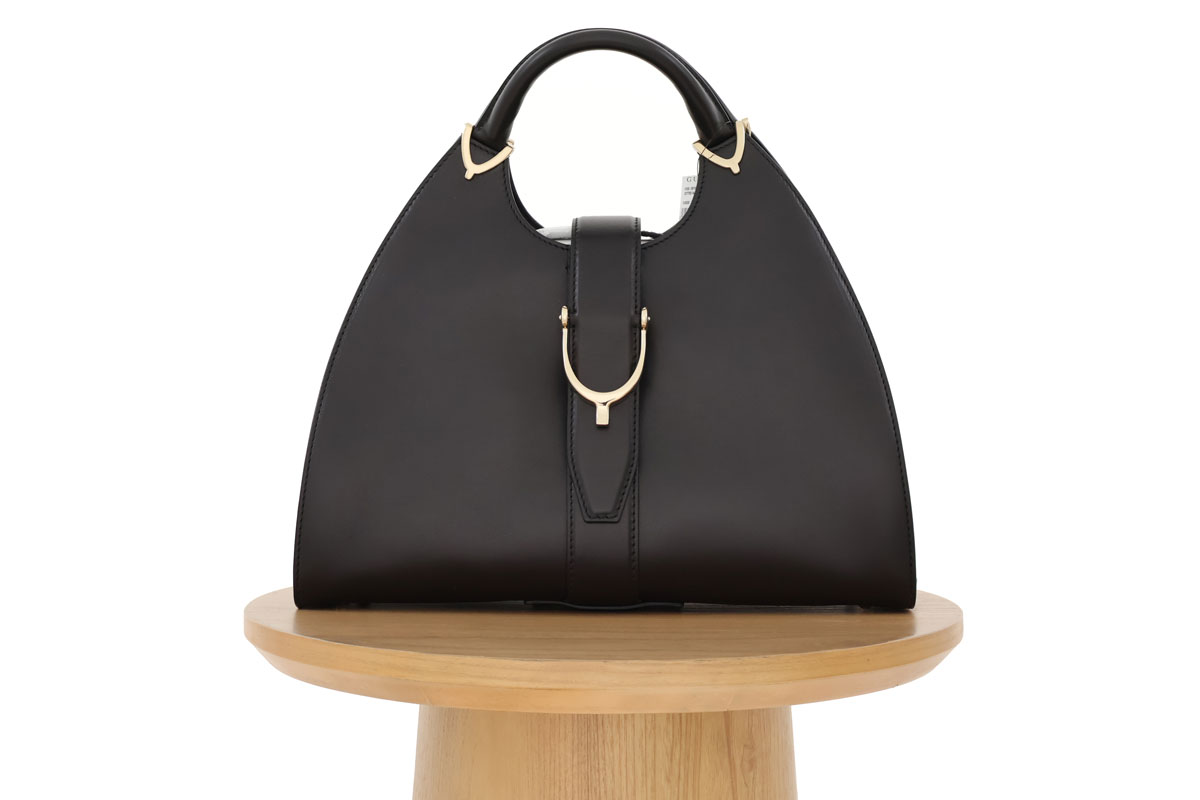 Gucci Stirrup Leather Top Handle Bag in Black. 277514 001998. Smooth structured calfskin top handle with light-gold toned hardware. Front horsebit snap closure and belt over top of bag that clips at one side. Studs protect the base. The interior is lined in cotton/linen textile and features one zippered pocket, one snapped pocket and two open pockets. Measures 15″ across the base x 15″ from top of handles to base x 6.5″. Made in Italy. This bag is brand new and comes with box, dust cover, original tissue, all original booklets & packaging materials and tag attached. *Please note* The box is faded on both ends.