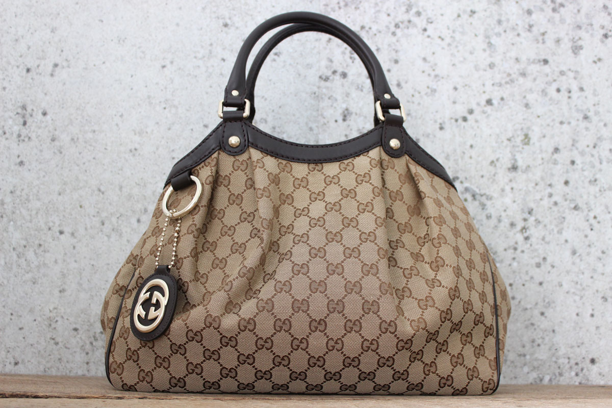 Gucci Sukey Medium GG Canvas Tote. This Gucci Sukey tote has never been carried. It is in NEW condition and comes with dust cover. Beige/ebony GG monogram canvas with dark brown leather trim and light gold hardware. Detachable interlocking G leather tag. Double handles with 7″ drop. Side snap and interior snap closure. Textile lining with zippered pocket. Measures 13″ x 9.8″ x 4.3″. Serial/Authenticity: D013322597. Style: 211944 467891. Made in Italy.