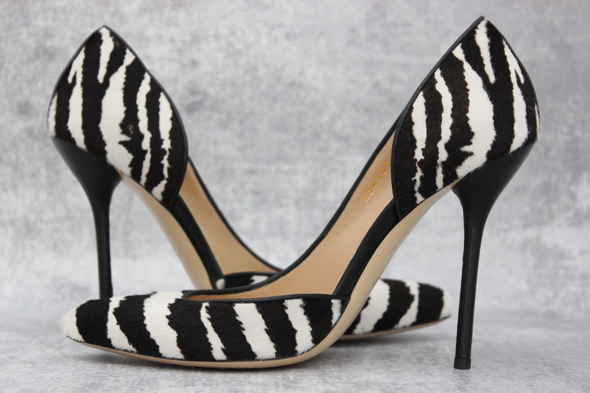 Gucci Zebra Print Calf Hair Pumps. Size 37. 4.25″ slim heel. Black leather trim and heel. Pointed toe. Cut-out side. Slip-on. Gently used.