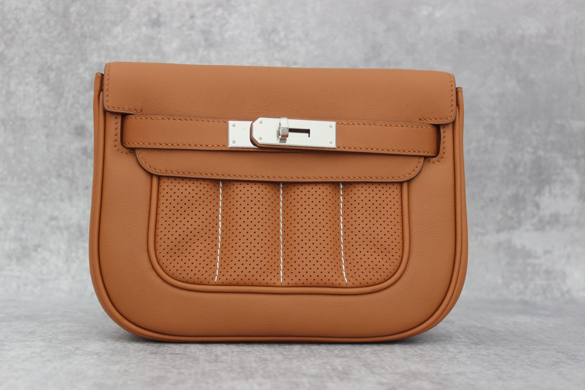 Hermes Berline 21 Mini Bag. Gold Swift leather with silver and palladium hardware. Quilted, perforated leather on front and back. The interior features a zippered pocket and a flat pocket. Measures 8.25″ x 6.25″ x 2.5″. Made in France. Stamped TMM 007 AP. THE STRAP IS MISSING. YOU MAY BE ABLE TO PURCHASE A REPLACEMENT STRAP THRU HERMES BUT THERE’S NO GUARANTEE THEY WILL HAVE ONE AVAILABLE FOR PURCHASE. MISSING STRAP. MARK AT BASE OF BAG. PLASTIC STILL COVERS MOST OF THE HARDWARE.