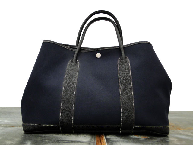 Hermes Navy Canvas & Leather Garden Party PM Tote Bag. Navy canvas, buffalo leather trim and handles and palladium hardware. Front snap. Side snaps. Made in France. Stamped V with I squared. Measures 14″ x 10″ x 7″. Handles have a 6″ drop to top of bag. This bag is in EXCEPTIONAL condition with dust cover.