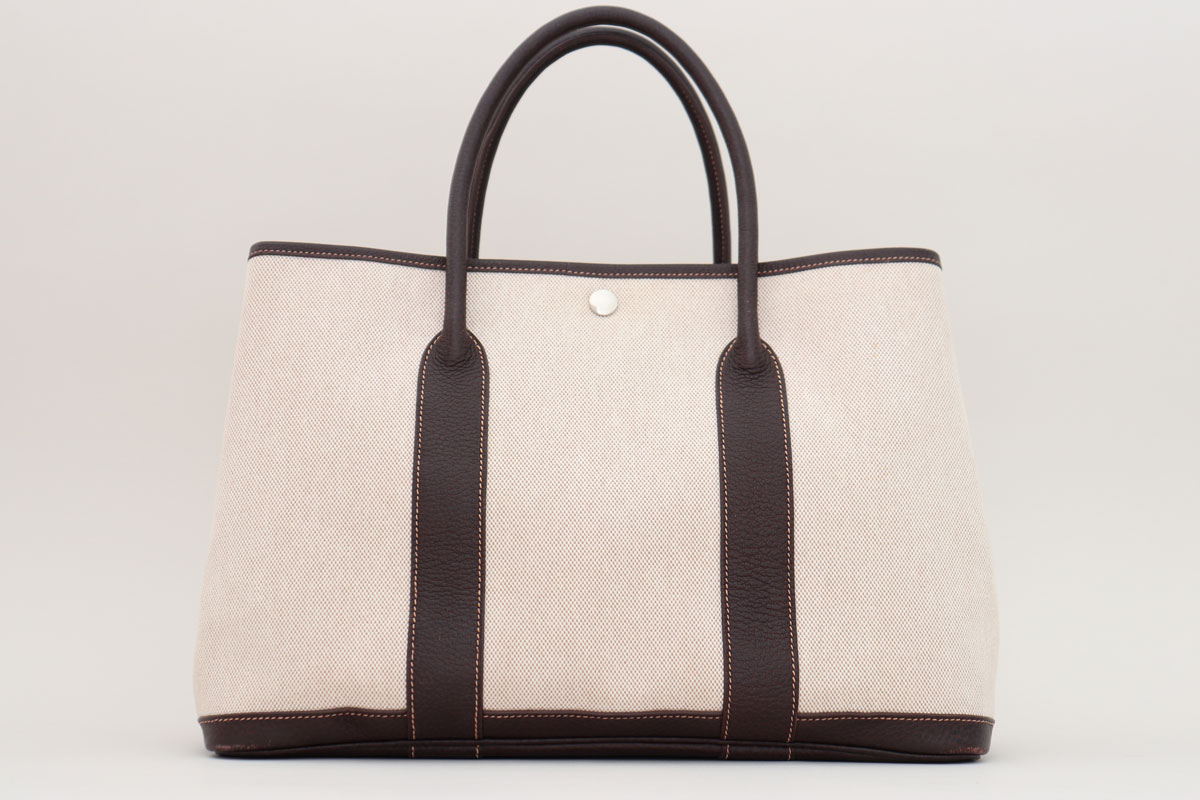 Hermes Toile Buffle Gala Garden Party Tote 36 MM. Marron Fonce. Blind-stamp V I in square. Year 2005. Features toile canvas with maroon fonce buffalo leather trim and palladium hardware. Side snaps. Interior snap closure. Double handles with 6″ drop. Measures 14.5″ x 10″ x 7″. There are pen marks on the interior. There are some stains/marks on the exterior canvas. There is rubbing at the base corners. There are marks on the handles.