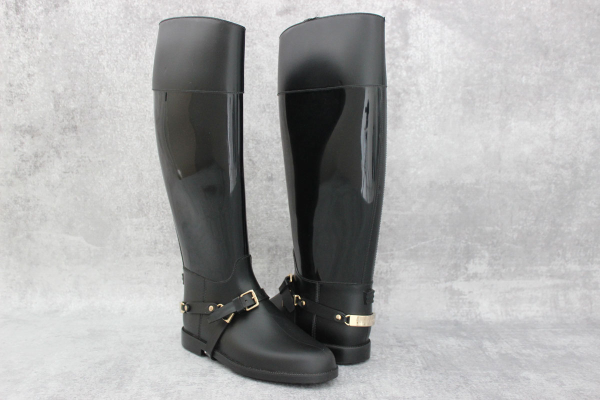 Jimmy Choo Black PVC Stirrup-Strap Cheshire Rain Boot Size 35. Golden buckles and Jimmy Choo nameplate adorn adjustable ankle stirrup strap. Matte PVC with shiny center. Round toe. 3/4″ flat, stacked heel. 16″ shaft with 15″ top circumference. Fabric lining and cushioned insole. Lugged rubber outsole for traction. Made in Italy.