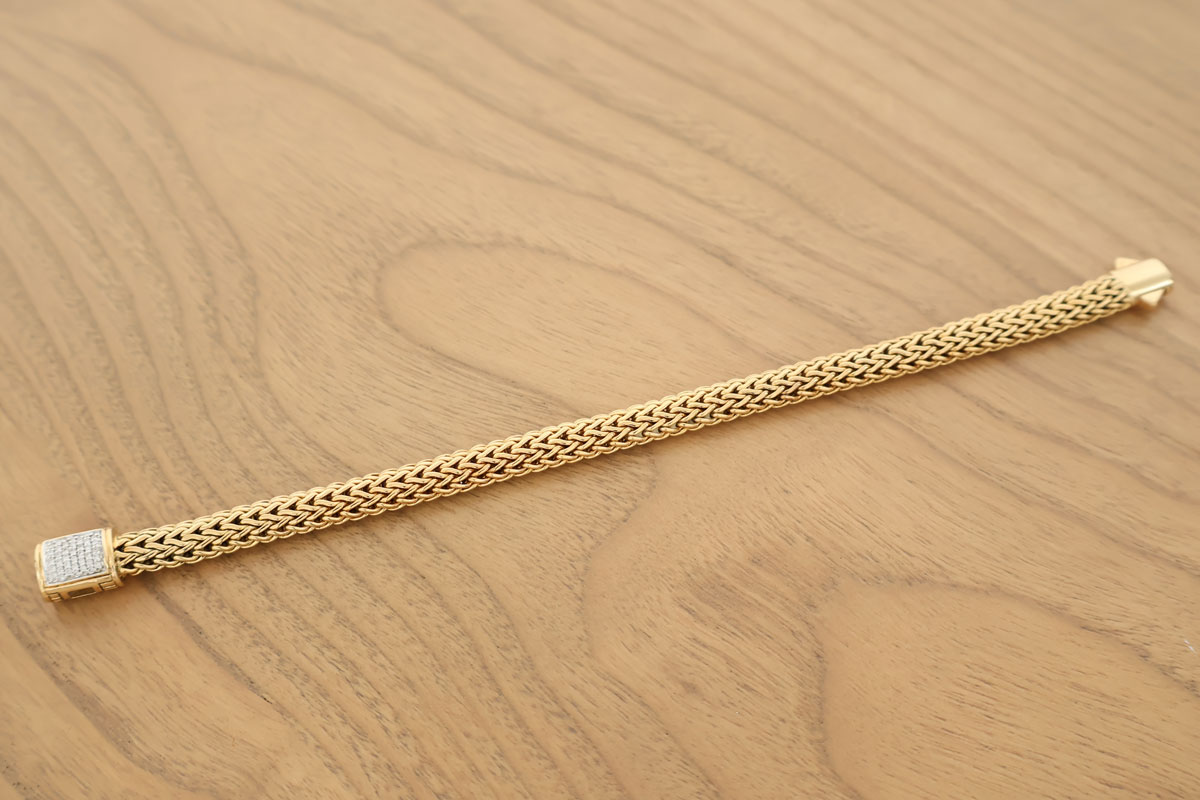 John Hardy 18K Yellow Gold & Diamond Wheat Chain Bracelet. 7mm. Weighs 49.5 grams. Measures 7.75″ total length. Size medium. Pristine condition. No box or pouch. Will come with a generic pouch.