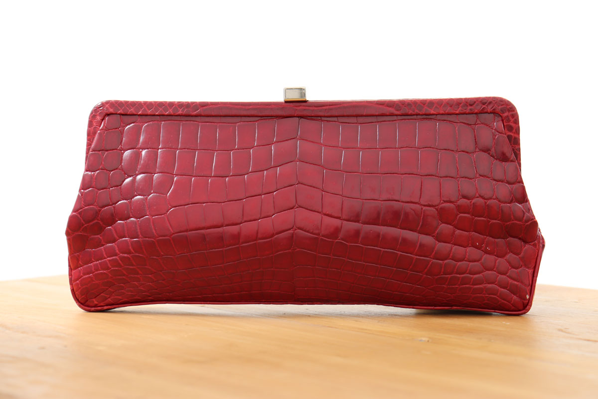 Lambertson Truex Red Crocodile Clutch. Features framed red crocodile with silver-toned LT clasp closure at the top and light blue suede lining with zippered pocket. Measures 12″ at widest x 5.5″. Genuine crocodile. This clutch is in good condition. There are some minor marks on the exterior. No dust cover.