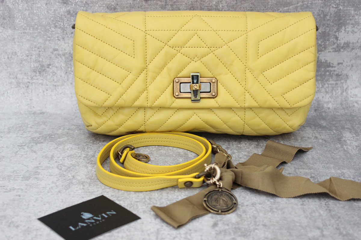 Lanvin Happy Quilted Leather Crossbody Clutch in Yellow. Strap detaches to carry as a clutch. Signature grosgrain ribbon and chain with Lanvin charm, long leather strap, textile lining, interior zippered pocket. Measures 11″ x 6″ x 3″. Authenticity: 31303. Made in Italy. This bag is in pristine, like new condition.