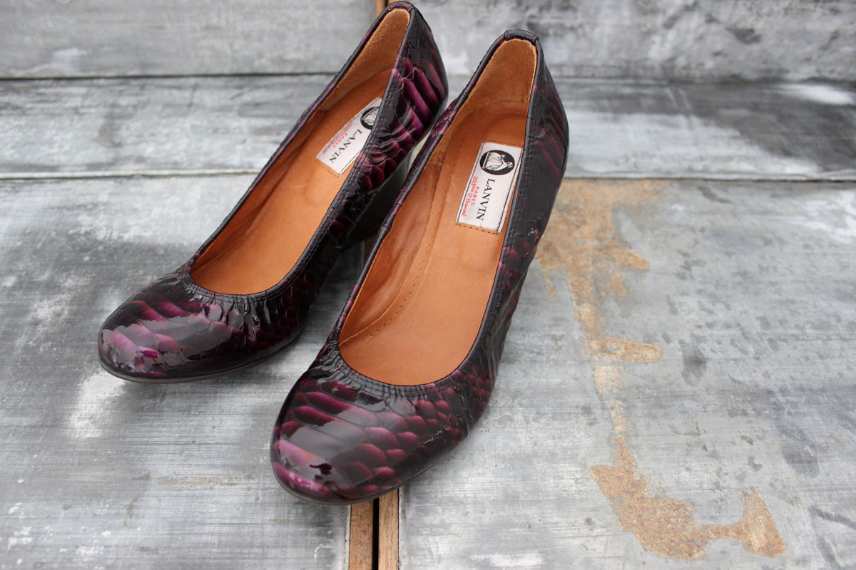 Lanvin Python Print Ballerina Wedges Plum Size 37.5. These are brand new never worn. No box. Glossy python embossed patent leather with scrunched collar, rounded toe and leather lining. 3″ stacked heel. Made in Portugal.