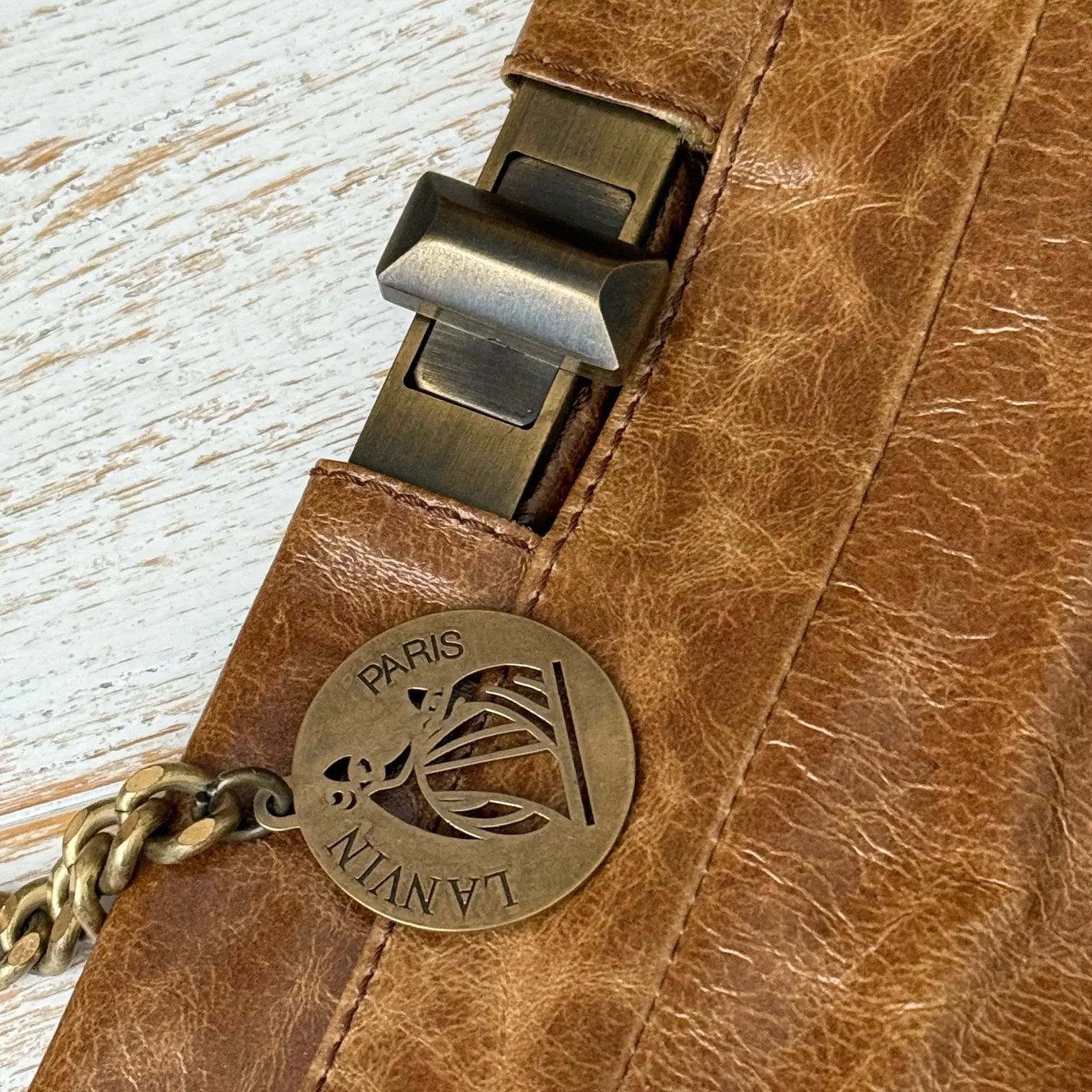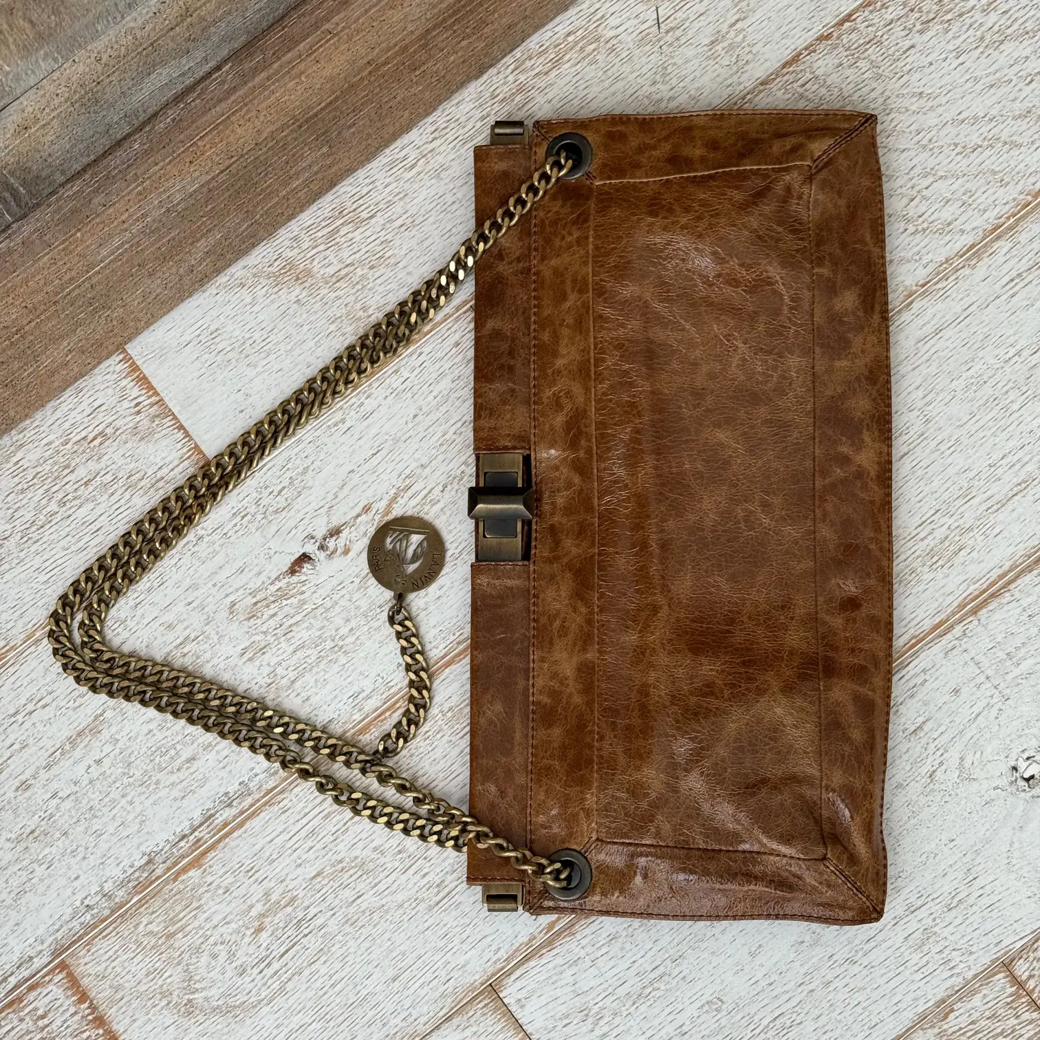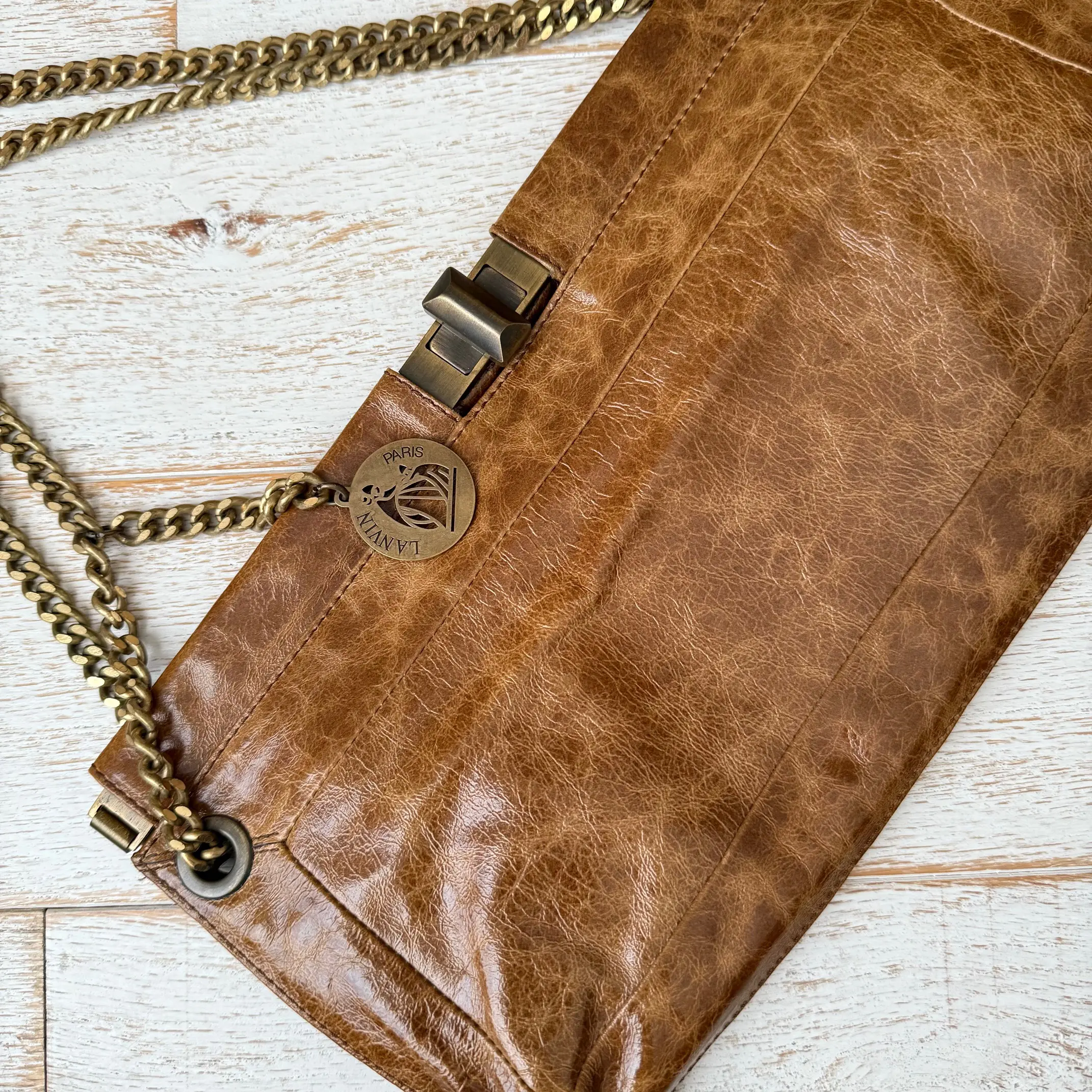 Lanvin Vintage Brown Crinkled Leather Bag. Features glossy crinkled leather with brass turn-lock closure, golden brass chain and Lanvin signature dangling charm. Chain can be worn doubled to wear short on the shoulder or pulled-thru to wear longer on the shoulder. When doubled the drop is approx. 8″. When pulled thru the drop is approx. 13.5″. Hinged at the top. Fabric lining with two main compartments, a center zippered compartment and a zippered pocket. Measures 14.5″ x 7.75″. Made in Italy. This vintage Lanvin bag is in new condition. No dust cover.