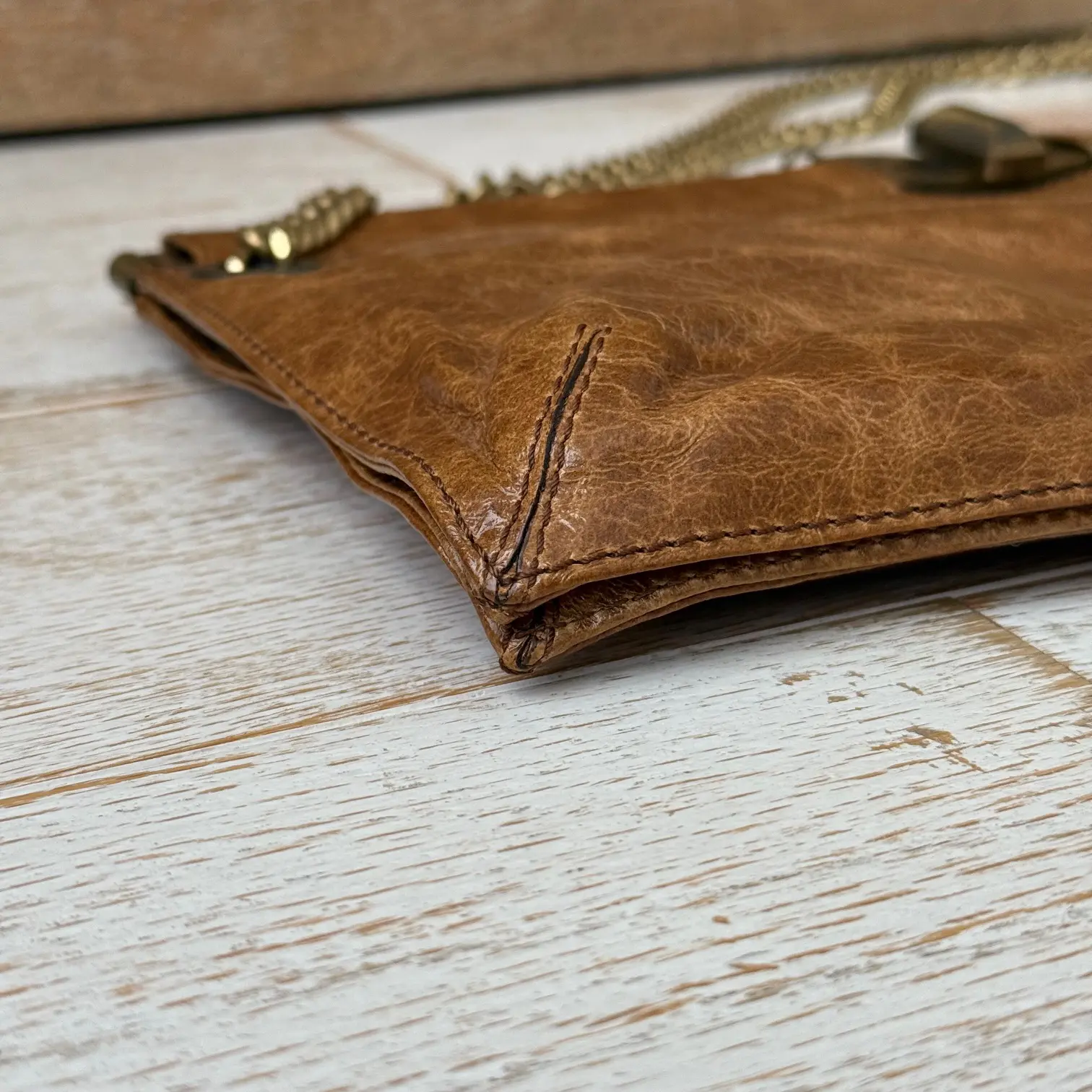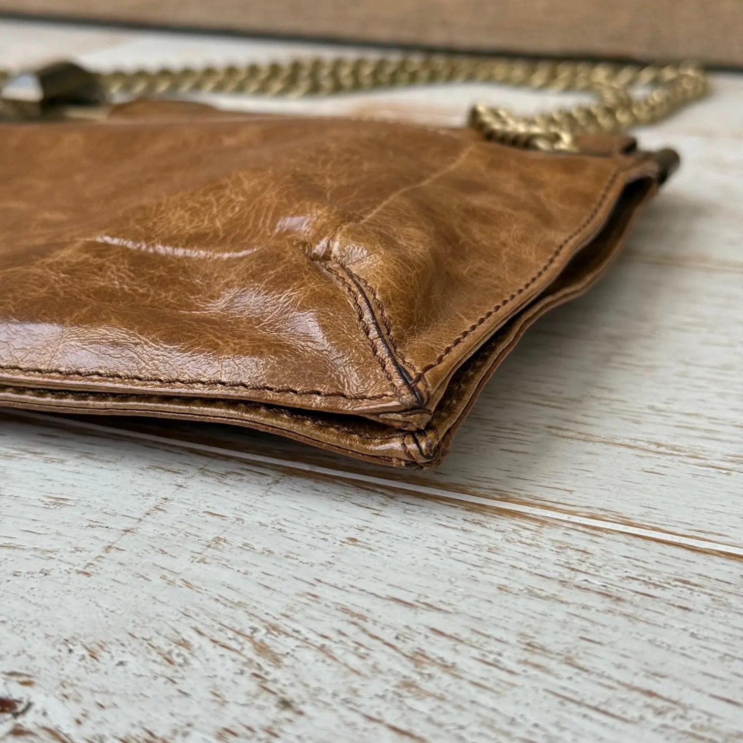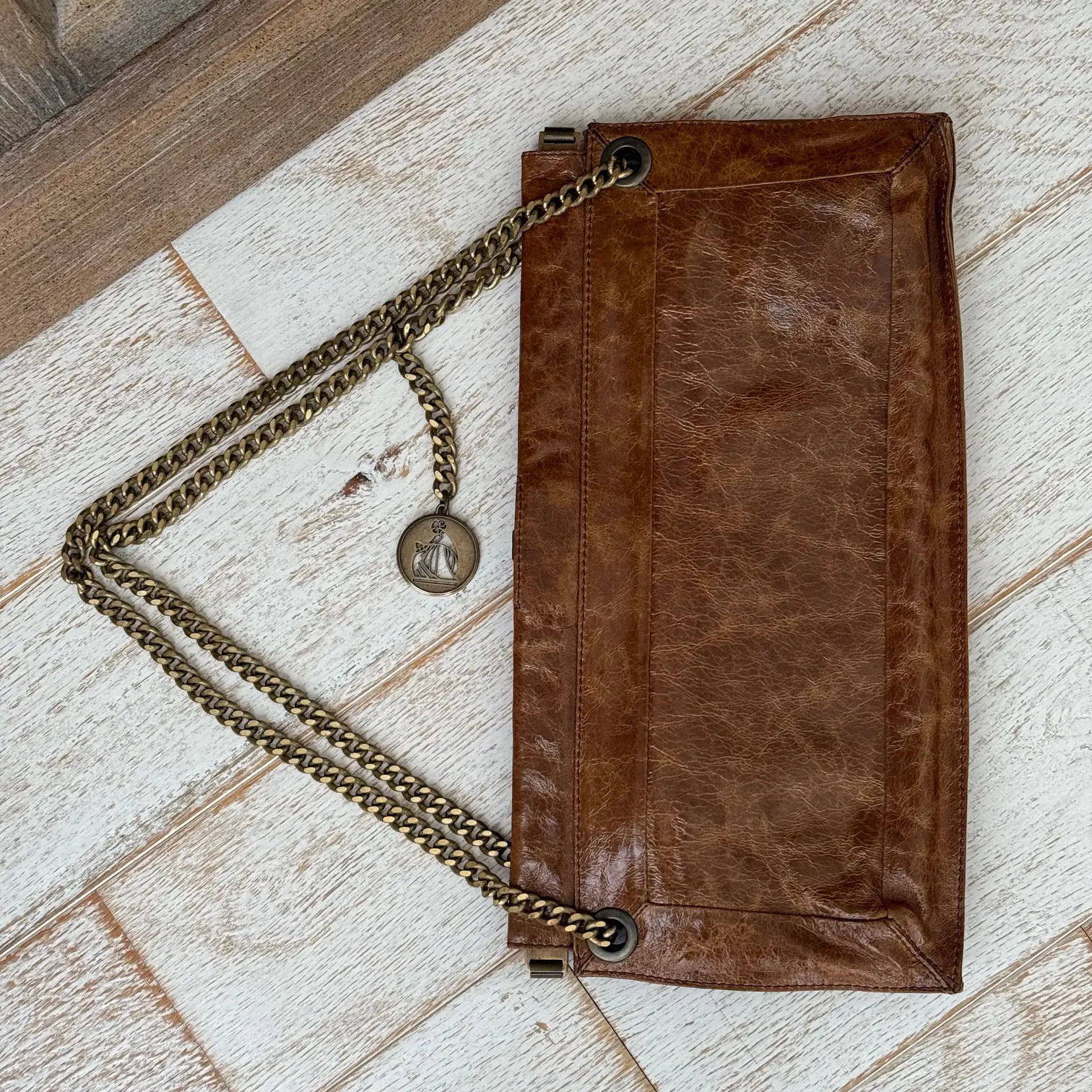 Lanvin Vintage Brown Crinkled Leather Bag. Features glossy crinkled leather with brass turn-lock closure, golden brass chain and Lanvin signature dangling charm. Chain can be worn doubled to wear short on the shoulder or pulled-thru to wear longer on the shoulder. When doubled the drop is approx. 8″. When pulled thru the drop is approx. 13.5″. Hinged at the top. Fabric lining with two main compartments, a center zippered compartment and a zippered pocket. Measures 14.5″ x 7.75″. Made in Italy. This vintage Lanvin bag is in new condition. No dust cover.