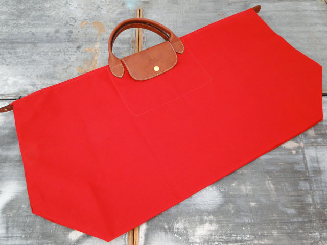 Red Nylon Le Pliage Shopping Tote. Carried one time. PRISTINE condition. Measures 19″ across top x 12.5″ down center x 7.5″ deep. Long straps with 11″ drop. Zip closure. Gold-tone hardware. Interior pocket. Made in France.