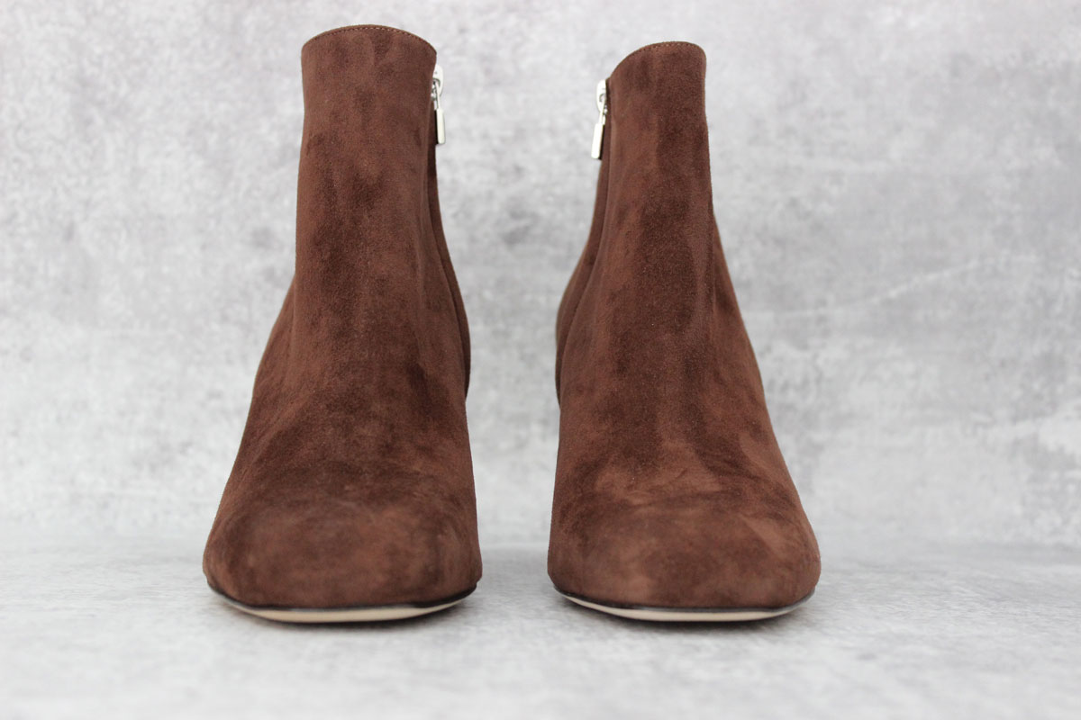 Loro Piana brown suede Liza ankle boots size 37. Side zips. Squared toe. 3″ block heel. Made in Italy. New. No box. $1,350 retail.