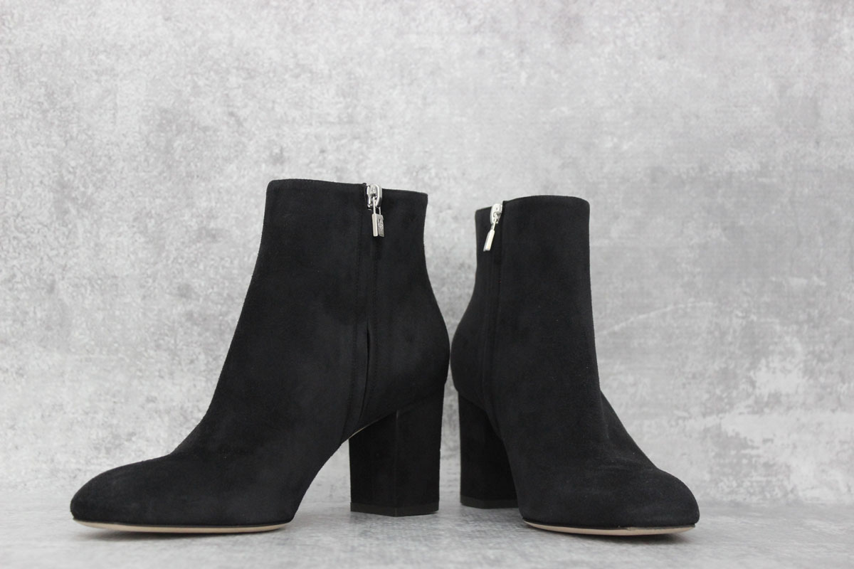 Loro Piana Liza Black Suede Ankle Boot. Size 37. US size 7. Side zips. Square toe. 3″ chunky block heel. Worn one time. Retail was $1350 plus tax. Made in Italy.