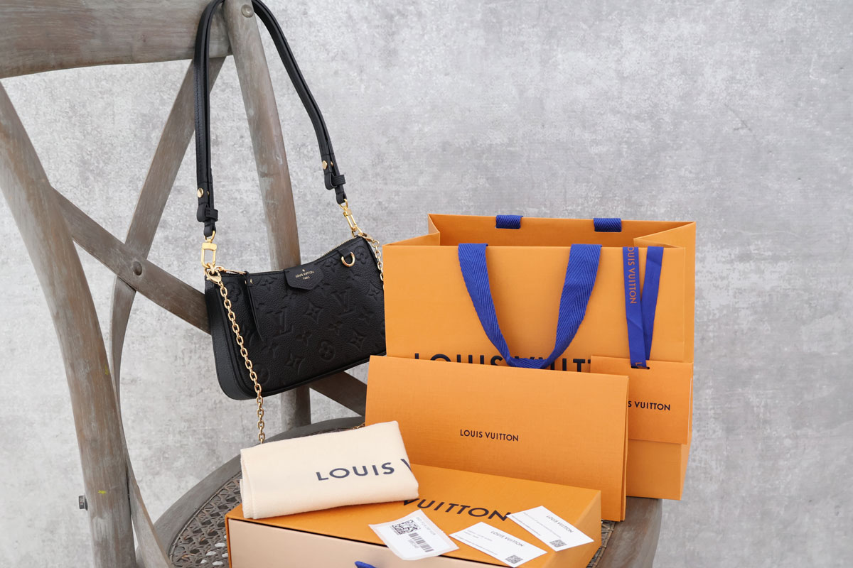 Louis Vuitton Black Monogram Empreinte Easy Pouch On Strap. Features monogram empreinte leather with gold-toned hardware, detachable short chain strap, detachable/adjustable leather cross body strap, a zip closure and striped textile lining. Measures approx. 8″ x 4.5″ x 1.25″. Microchipped. Brand new. Comes with box, dust cover, LV shopping bag, receipt holder, ribbon, tags and gift card envelope.