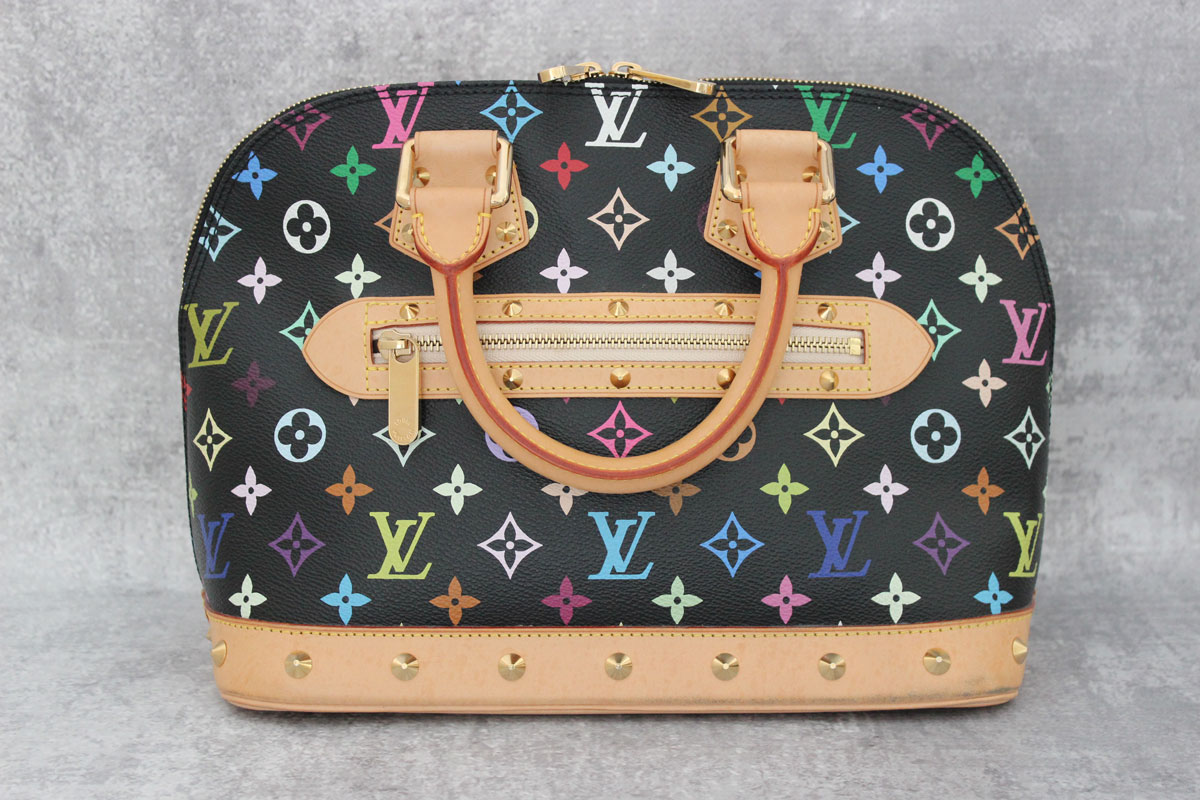 Louis Vuitton Black Multicolor Monogram Alma PM. Double zip closure, rolled leather top handles, golden studs, zip-front pocket and grey alcantara lining with cell phone and flat pocket. Measures 12.5″ x 9.5″ x 6.5″. Made in France. Date Code: FL0014. Condition: there is a mark on the base near the edge. The handles have some marks but are still fairly light. There are light marks along the leather trim at the base and some marks at the base from rubbing against denim. The interior is clean. The hardware is shiny and scratch-free. No dust cover but will be packaged with care.