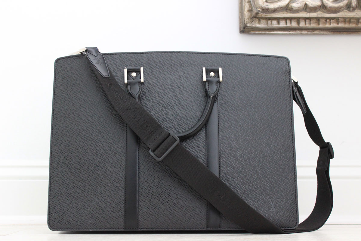 Louis Vuitton Black Taiga Leather Lozan Briefcase. Features sturdy taiga leather, matte silver hardware, LV embossed at bottom corner, rolled leather top handles, a zip-top closure, three spacious compartments, a long slip-in pocket and leather lining with d-ring. Included is a detachable, adjustable Louis Vuitton embossed wide utility strap that was purchased separately for over $300. Measures 16.25″ x 12″ x 3″. Date Code/Authenticity: VI0040. Made in France. This Lozan briefcase is in excellent condition. The outside looks fantastic with only slight marks at the back bottom edge. The corners are perfect. The interior leather lining has some light scratches but is still in excellent, CLEAN condition. There is one area at the top near the inner corner that shows a scuff mark (see picture #9). Comes with dust cover.
