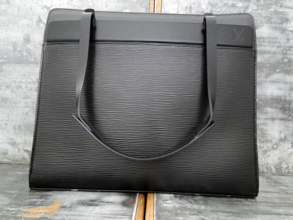 Louis Vuitton black epi leather CROISETTE PM shoulder bag. Black epi leather and smooth leather trim. LV embossed at upper corner. Double straps with 8″ drop to top of bag. Zip top flanked by two open compartments. Zipper snaps to bag at one end. Black textile lining with flat pocket and cell pocket. Date Code/Authenticity: CA0072. Made in Spain. Measures 12″ x 10.5″ x 4″. This bag is in excellent condition. there are some very light white marks at the base of the bag on the edges. The zipper (see photo) has tarnishing. There are no other issues. This is a great everyday where to work bag! Fits an Ipad.