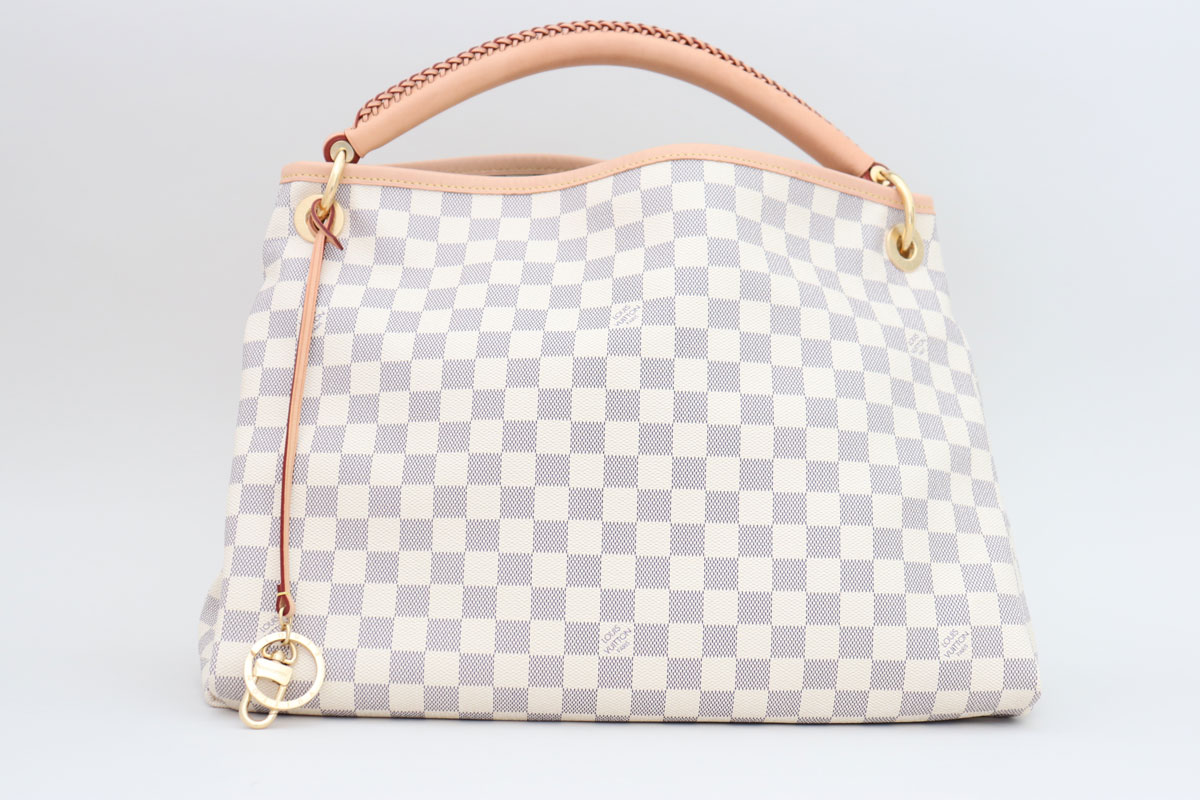 Louis Vuitton Damier Azur Artsy MM. Features damier azur canvas, gold-tone hardware, natural cowhide handle with woven top-stitching, studs to protect the base and beige microfiber lining with six flat pockets, a zippered pocket and d-ring. Measures 16″ x 12.25″ x 7″. Made in USA. This bag is in excellent condition. There is a scratch in the leather at the base (see up close photo of base). The handles has some light marks. All of the ring hardware and the zipper still have their protective plastic covering. The interior is immaculate and looks brand new. Comes with box, dust cover, ribbon, gift receipt and receipt holder. The box is a little mis-shaped.