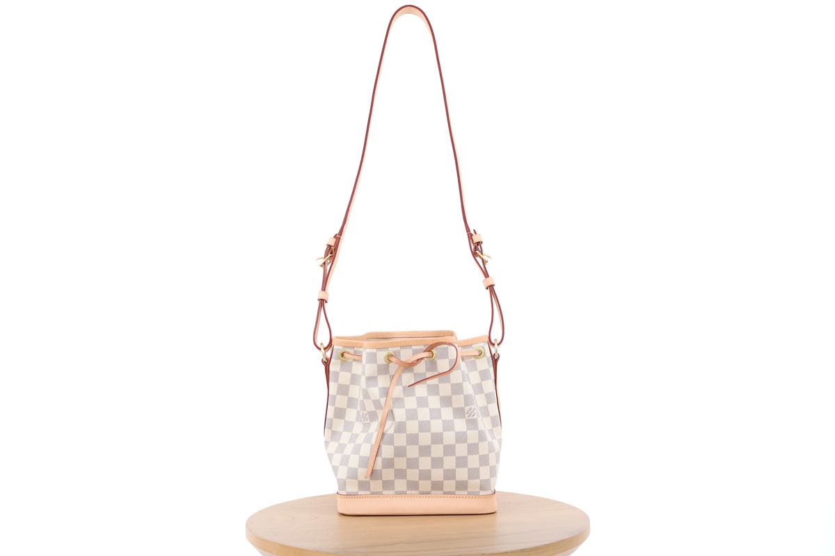 Louis Vuitton Damier Azur Noe BB. Features damier azur canvas with natural cowhide trim and gold-toned hardware. Drawstring closure. Adjustable shoulder strap to wear on the shoulder or crossbody. Textile lining with d-ring. Strap has a max drop of 21.7″ and a minimum drop of 19.7″. Measures 9.4″ x 8.7″ x 5.9″. Made in France. Microchipped. This bag is in excellent condition. There are minor watermarks on the leather parts. Comes with box, receipt, tag and dust cover.