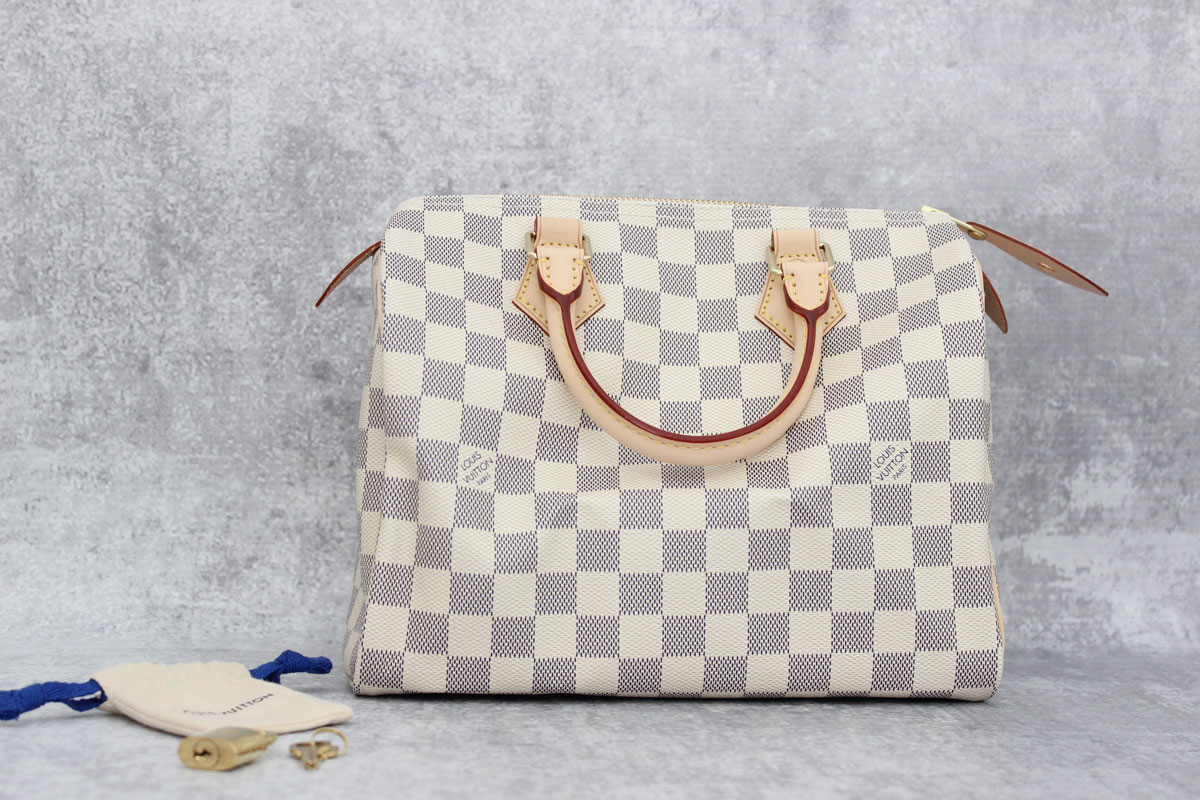 Louis Vuitton Damier Azur Speedy 25. Classic updated Speedy 25 with zippered pocket. This is a 2018 Speedy and it is brand new. Comes with lock and key set, dust cover for lock and key set, box, dust cover, tags and ribbon. Measures 9.8″ x 7.5″ x 5.9″. Made in U.S.A. Date Code: SD4128.