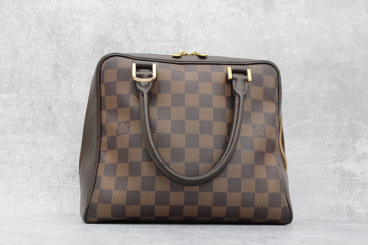 Louis Vuitton Damier Ebene Brera. Features damier ebene canvas with brown leather trim, golden brass hardware, double zip closure, rolled leather top handles and terracotta alcantara lining with zippered pocket. Measures 9.75″ x 8″ x 4.5″. Date Code: VI0011. Made in France. This bag is WELL WORN. In particular, the edges have dark rubbing marks, the interior alcantara lining has wear along the top, the underside of the handles are darker from carrying and there is a rip in the lining of the interior zippered pocket (see photo). Sold as is. No dust cover.