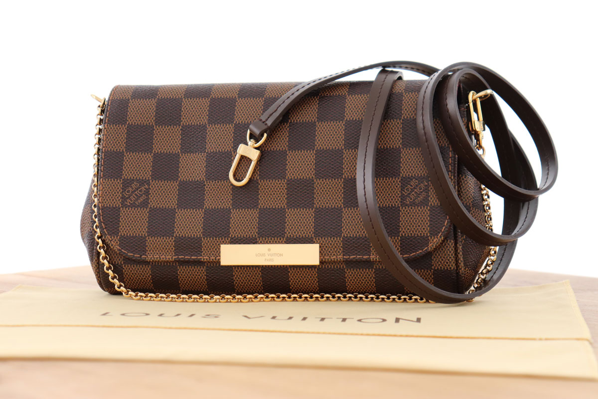 Louis Vuitton Damier Ebene Favorite PM. Features damier ebene canvas, gold-tone hardware, gold-tone chain strap, brown leather crossbody strap, flap with hidden magnetic closure and textile lining with flat pocket. Measures 8.25″ across the base x 5″ x 1.5″. Date Code: FL2173. Made in France. This bag is in pristine condition. Comes with dust cover.