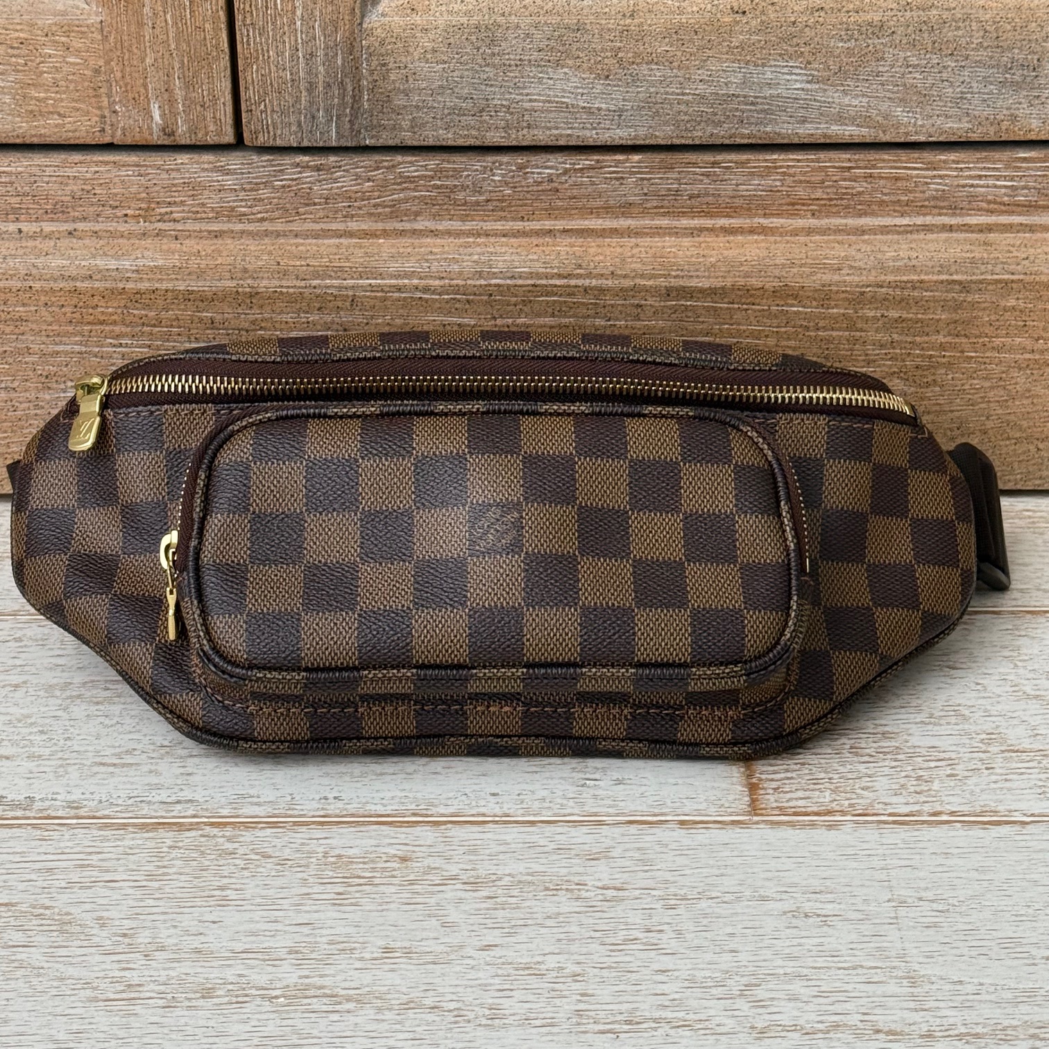 Louis Vuitton Damier Ebene Melville Bum Bag. Features damier ebene canvas, smooth leather trim, fully adjustable utility strap, three zippered compartments and brown textile lining. Strap can be worn across the body or around the waist. Measures approx. 13″ at widest x 5″. The front compartment measures approx. 7″. The back compartment measures approx. 9.25″. Made in France. Date Code: VI0076. There is some oxidation on the two front zipper pulls. Otherwise, this LV Melville Bum Bag is in pristine condition. No dust cover.