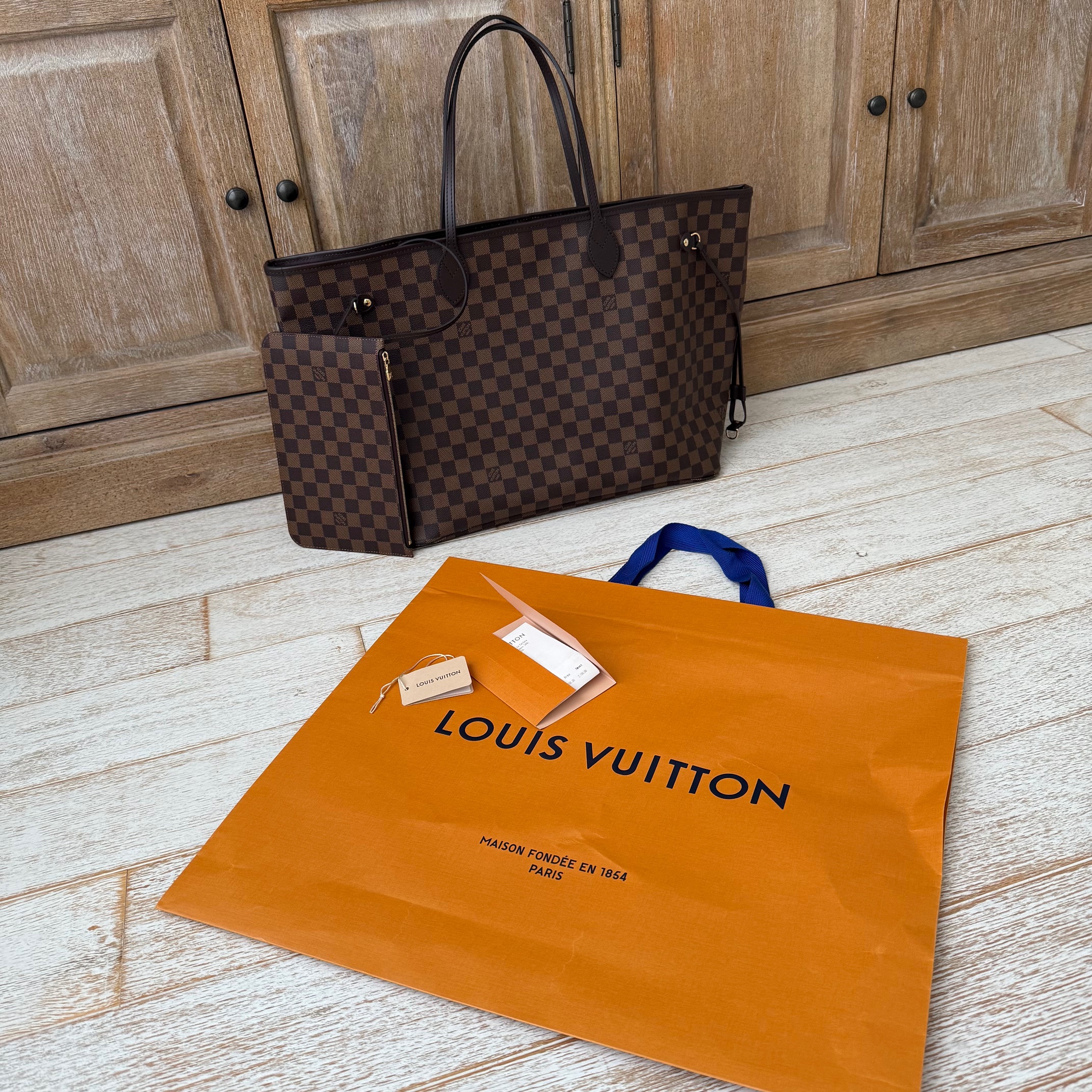Louis Vuitton Damier Ebene Neverfull GM. Features damier ebene canvas with gold-toned hardware, smooth leather trim, side ties, hook closure, double handles and red textile lining with zippered pocket and d-ring. Comes with a removable, zippered pouch that can be carried separately. Measures 15.4″ x 12.6″ x 7.5″. Microchipped. Purchased just two months ago. This bag is in new condition however there is a small white-ish mark on the interior lining. Please zoom in on photo of the interior to see. Comes with all tags, shopping bag, dust cover and original receipt with owners information redacted.