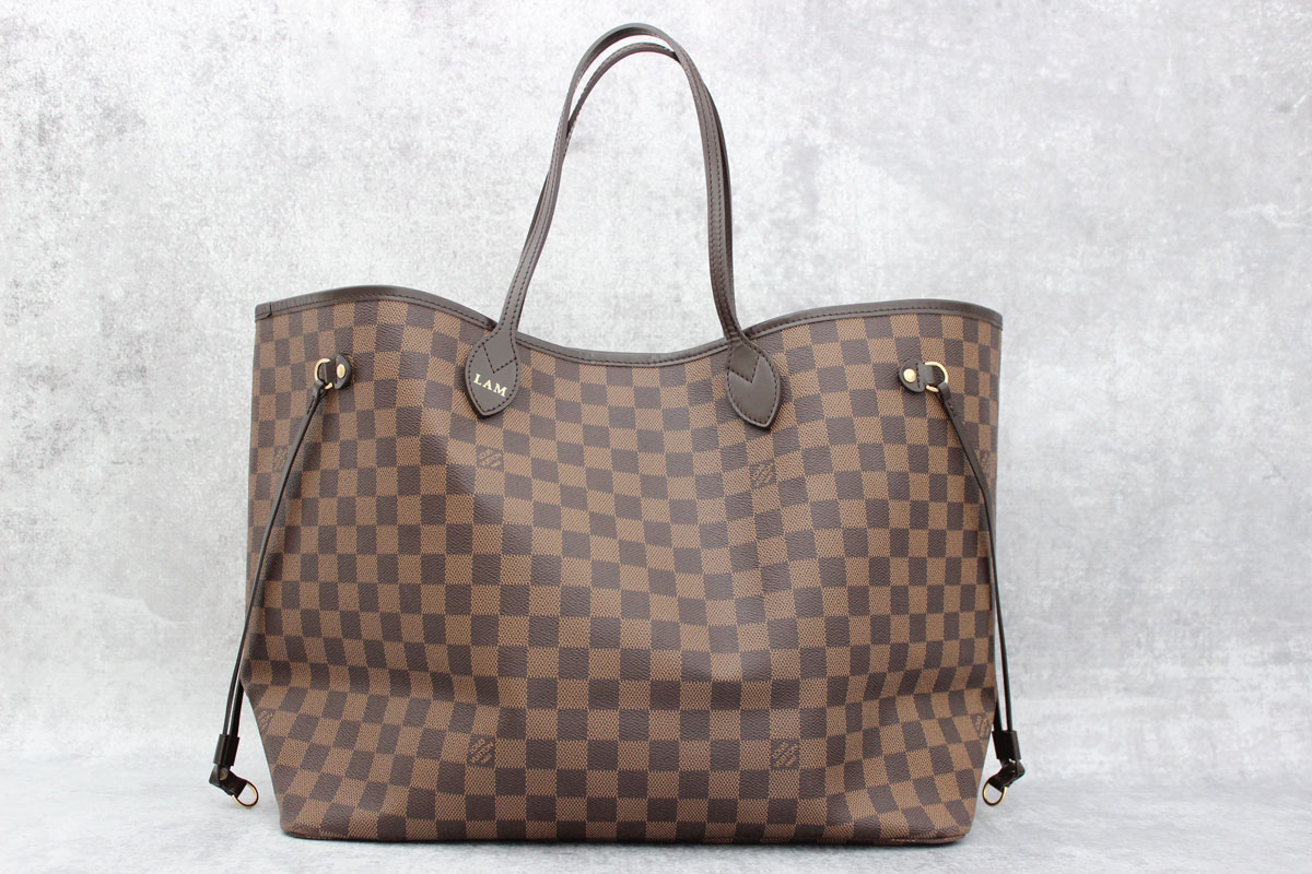 Louis Vuitton Damier Ebene Neverfull GM. Please note the initials LAM are embossed on this bag. This Neverfull is in EXCELLENT condition. There are some minor marks on the bottom interior. The exterior including straps, corners and hardware are all excellent. This is the largest Neverfull and measures 15.7″ x 13″ x 7.9″. Made in U.S.A. Date Code: SD0132. Comes with dust cover. This is a 2012 model and did not come with a zippered pouch. Will ship flat and folded.