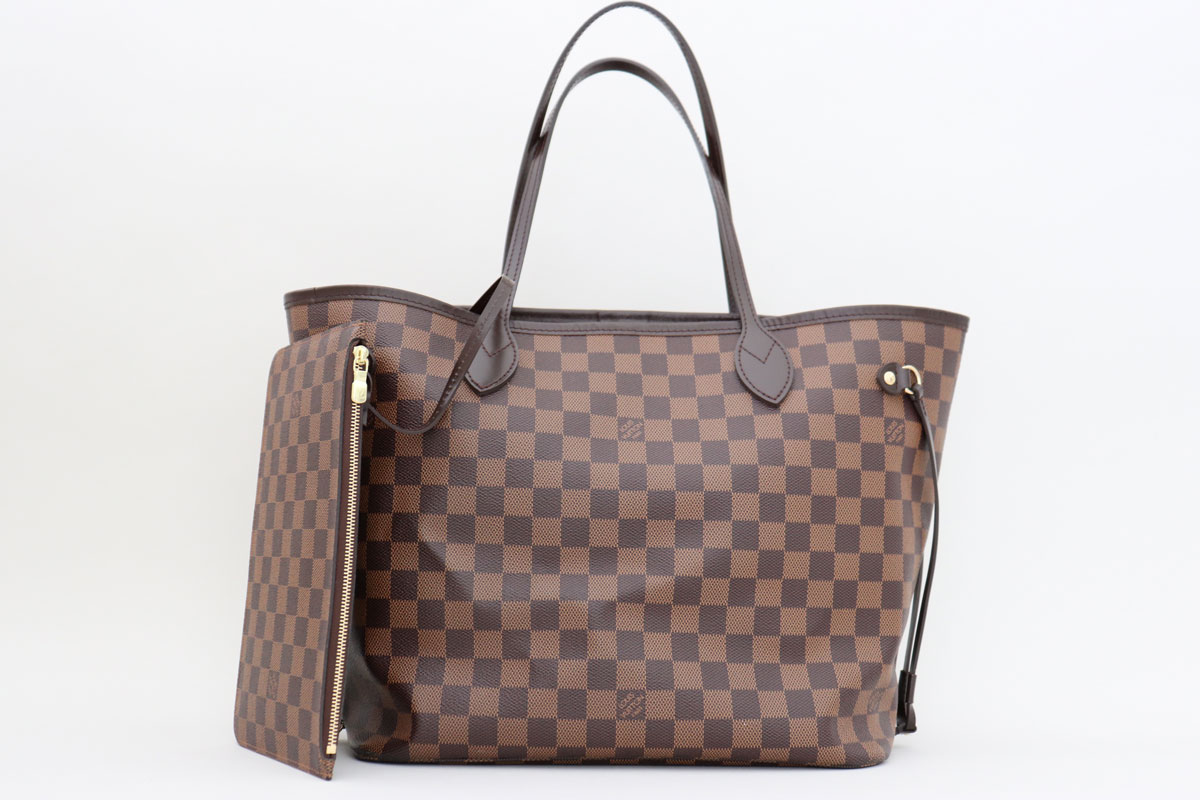 Louis Vuitton Damier Ebene Neverfull MM. Features damier ebene canvas with smooth leather trim, gold-tone hardware, side ties, interior clasp closure and red striped textile lining with zippered pocket and d-ring. Comes with accessory pouch and dust cover. Measures 12.6″ x 11.4″ x 6.7″. Made in USA. Date Code: SD0196. In excellent condition. There is some rubbing to the bottom corners and some rubbing to the trim at the top. The interior is clean. The pouch looks un-used and the straps are still nice and stiff.