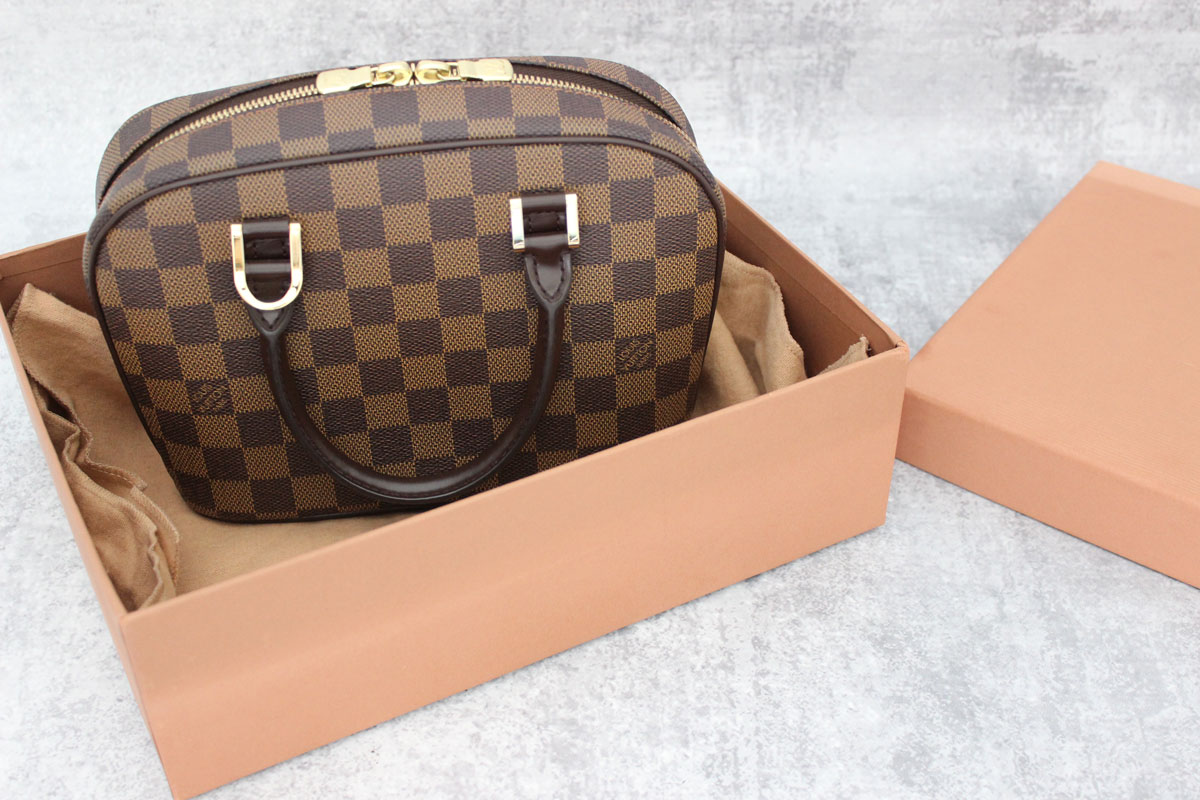 Louis Vuitton Damier Ebene Sarria Mini. This small satchel features damier ebene canvas, golden brass hardware, a double zip closure, rounded leather top handles and terracotta alcantara lining with patch pocket. A shoulder strap can be added for shoulder carry. Measures 9″ (at widest) x 6″ x 3.5″. Date Code: CA0091. Made in Spain. This bag is in pristine condition and comes with dust cover and box! There is one tiny white mark on one side (it’s really tiny). This bag otherwise looks new inside and out. The hardware is shiny and scratch-free. The corners have no rubbing, the interior is spotless and the handles look untouched.