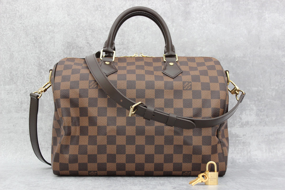 Louis Vuitton Damier Ebene Speedy 30 Bandouliere. This bag is in NEW condition, purchased in 2016 and carried once or twice if at all. It comes with lock & key set, dust cover and tags. Customers receipt is shown in photos but will not be included with sale. Made in U.S.A. Date Code: SD2136. Measures 11.8″ x 8.3″ x 6.7″.