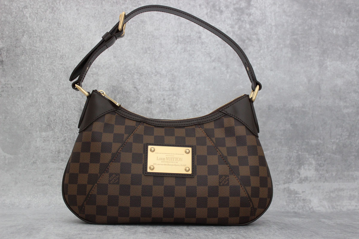 Louis Vuitton Damier Ebene Thames PM. Zip-top closure. Adjustable shoulder strap. Louis Vuitton Inventeur plague at front. Red textile lining with flat pocket and cell pocket. Measures 12.75″ x 8.5″ x 2.5″. Made in U.S.A. Date Code: SD5008. This bag is in NEW condition and comes with dust cover.