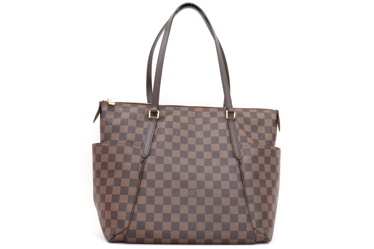 Louis Vuitton Damier Ebene Totally MM. Features damier ebene canvas, smooth leather trim, flat leather straps with 9.25″ drop to top of bag, open side pockets, zip-top closure and red textile lining with three flat pockets and a d-ring. Measures approx. 16″ across the top x 11.8″ x 6.7″. Made in USA. This bag is in pristine condition inside and out. No dust cover.