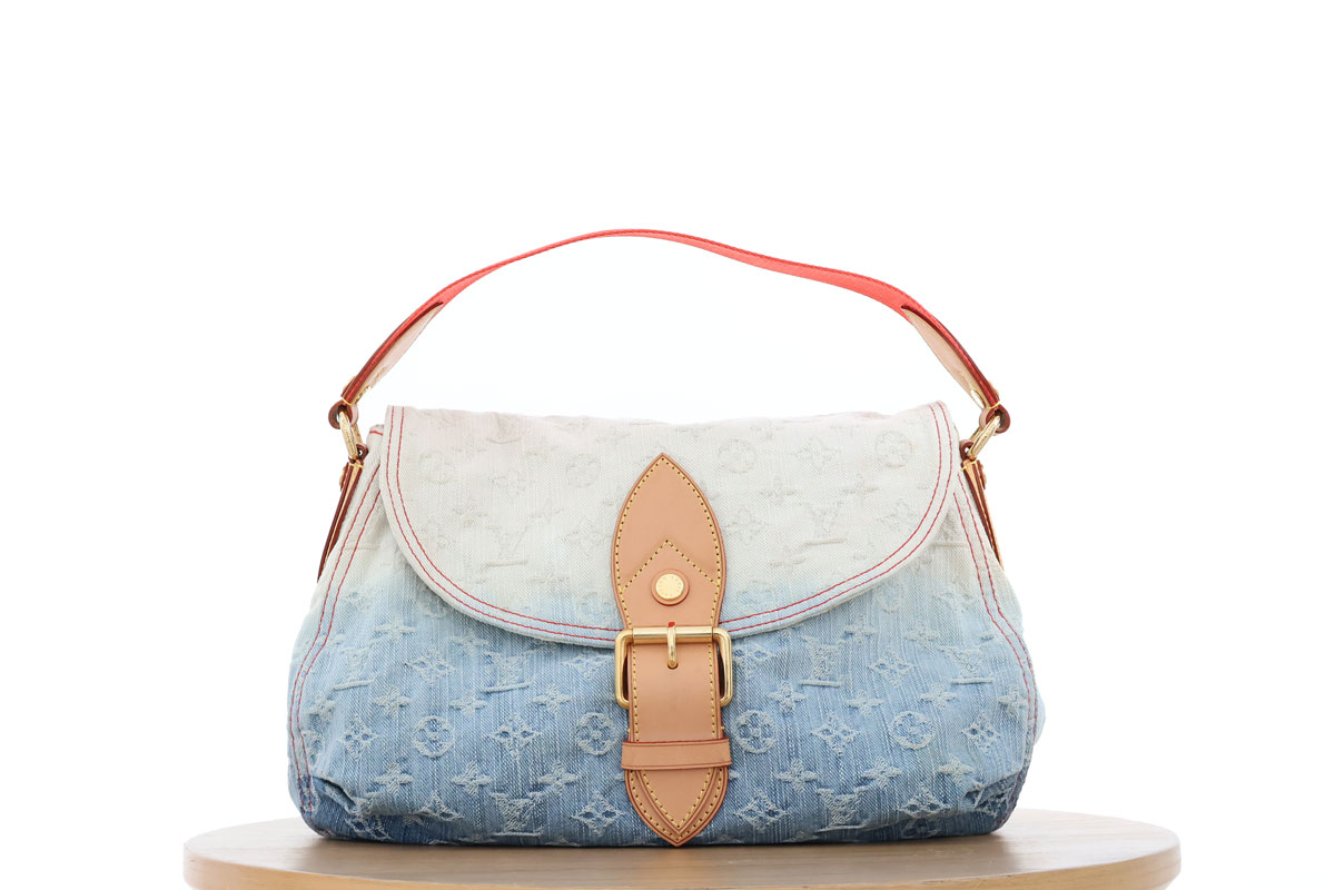 Louis Vuitton Blue Denim Sunray Shoulder Bag. Features monogram denim in shades of blue with natural cowhide trim and red Louis Vuitton embossed strap. Buckle closure. Blue microfiber lining with flat pocket. Measures 13″ x 8.5″. Strap has a drop of 5.5″ to top of bag. Made in France. Date Code: TR2120. This bag is in excellent condition. There are some marks to the denim, some marks to the leather trim and some minor scratches on the hardware. The interior is immaculate. Comes with dust cover.