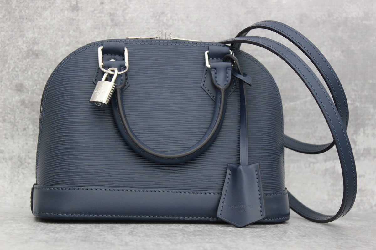 Louis Vuitton Epi Alma BB Indigo. Beautiful blue epi leather with silver-tone hardware, rolled leather top handles, detachable strap, double zip closure and indigo microfiber lining with flat pocket. Measures approx. 9.5″ x 7″ x 4.5″. Made in U.S.A. Date Code: SD2115. Carried one time. Comes with key clochette, two keys, padlock and detachable strap. No dust cover but will be packaged with care.