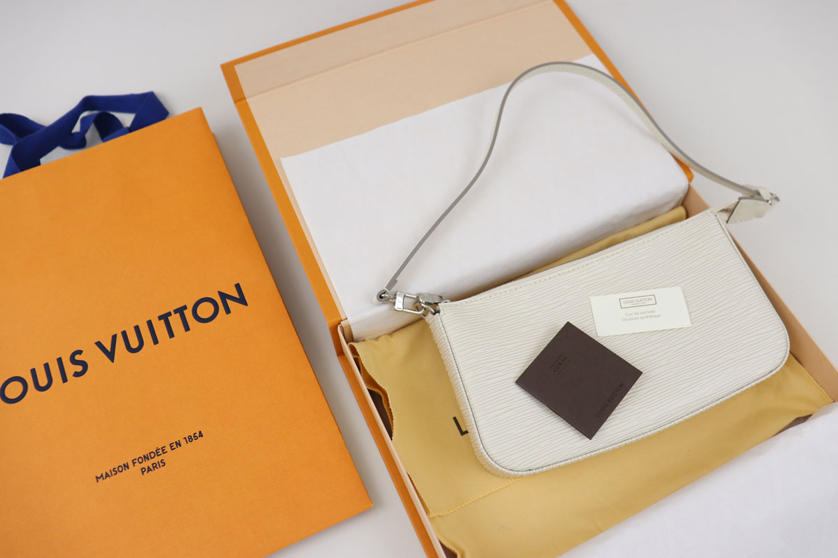 Louis Vuitton Pochette Accessories NM Ivory. Features ivory (natural) epi leather with smooth leather trim, LV embossed at bottom corner, silver-tone hardware and suede lining with pocket. Measures 9″ x 5.25″ x 1.5″. Made in France. Date Code: TR5113. Brand new. Comes with box, tags, dust cover and bag.