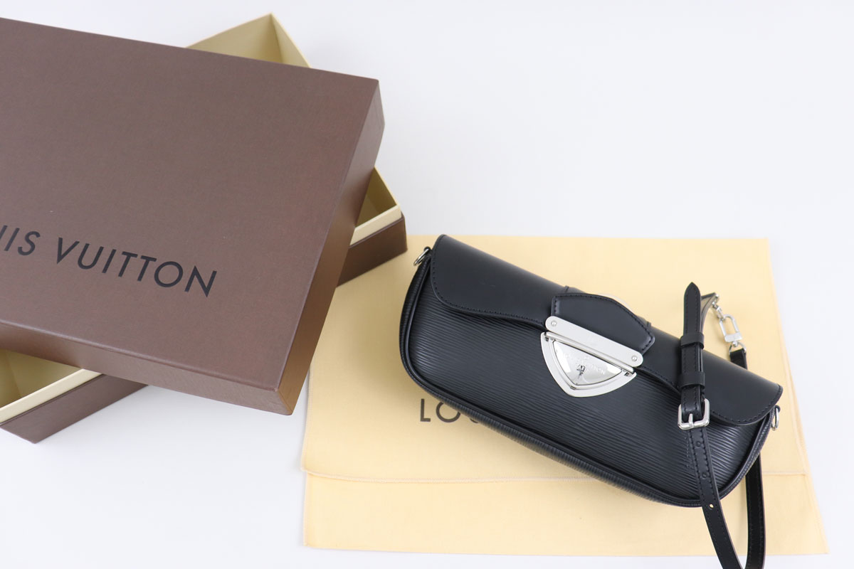 Louis Vuitton Epi Montaigne Clutch in Black. Features black epi leather with smooth leather trim, detachable, adjustable strap and silver-tone hardware. Black microfiber lining with patch pocket. Date Code: TH0028. Measures 10.4″ x 3.9″ x 2.4″. Made in France. This bag is in NEW condition and comes with box and dust cover.