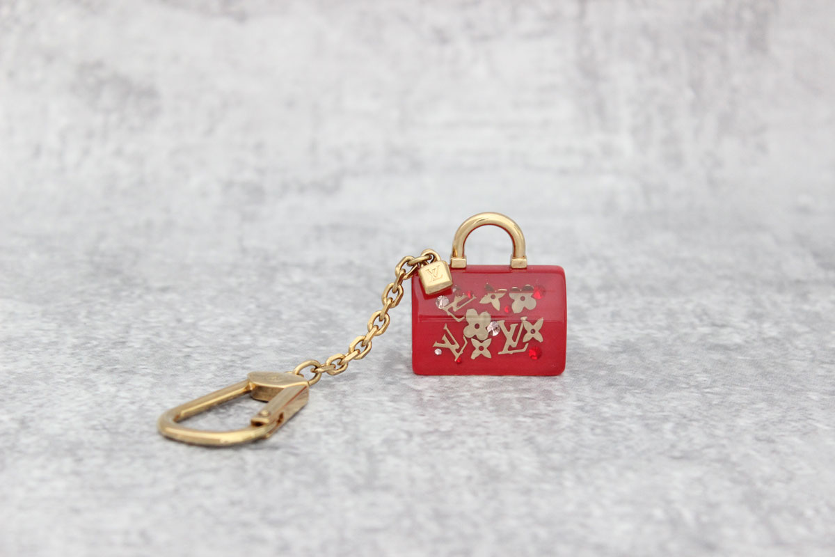 Louis Vuitton Red Pomme D Amour Inclusion Speedy Bag Charm, Key Chain. Hang it on your bag as a charm or use it as a key holder. Red resin with gold monogram symbols, red and clear crystals, and gold-tone hardware. Shaped like the speedy bag with a gold-tone top handle, key holder and little gold-tone LV padlock charm. This inclusion Speedy bag charm is in NEW condition. No box or pouch but will be packaged with care.