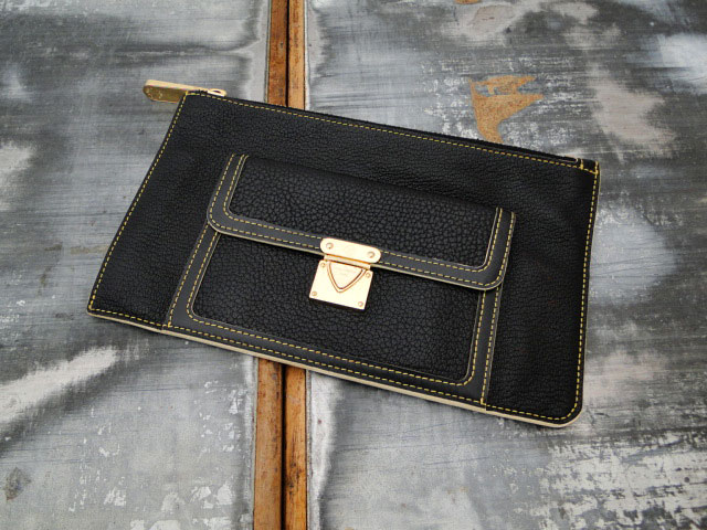 Louis Vuitton L’INSEPARABLE Cosmetics Case ~ Clutch. Black suhali leather with yellow top-stitching and golden s-lock front pocket. Zip-top. Black leather lining. Date Code/Authenticity: DU1015. Made in France. Measures 8.3″ x 5.1″. Overall very good condition. The suhali leather is in excellent condition inside and out. The gold-tone hardware including s-lock and zipper pull show scratches and discoloration/tarnishing/marks (on the front s-lock hardware). Comes with dust cover and box. Carry as a clutch or use for cosmetics.