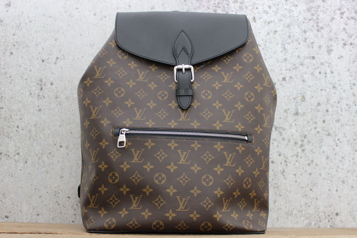 Louis Vuitton Monogram Macassar PALK Backpack. Monogram canvas with black matte cowhide leather and Palladium hardware. Buckle closure, interior zippered pocket, press-studs at the sides, adjustable straps and foamed interior compartment that holds a 15″ laptop. There is also a flat pocket and d-ring on the interior. Pale burgundy textile lining. Measures a large 13.8″ x 17.7″ x 5.9″. Date Code/Authenticity: SR4113. Made in France. This backpack was purchased and then stored away… without it’s dust cover. There are two areas that have light white rub marks (see photos). They are both under the flap and most likely occurred during storage. Carried three times at most, this backpack is a gem! The current retail is $2,370.